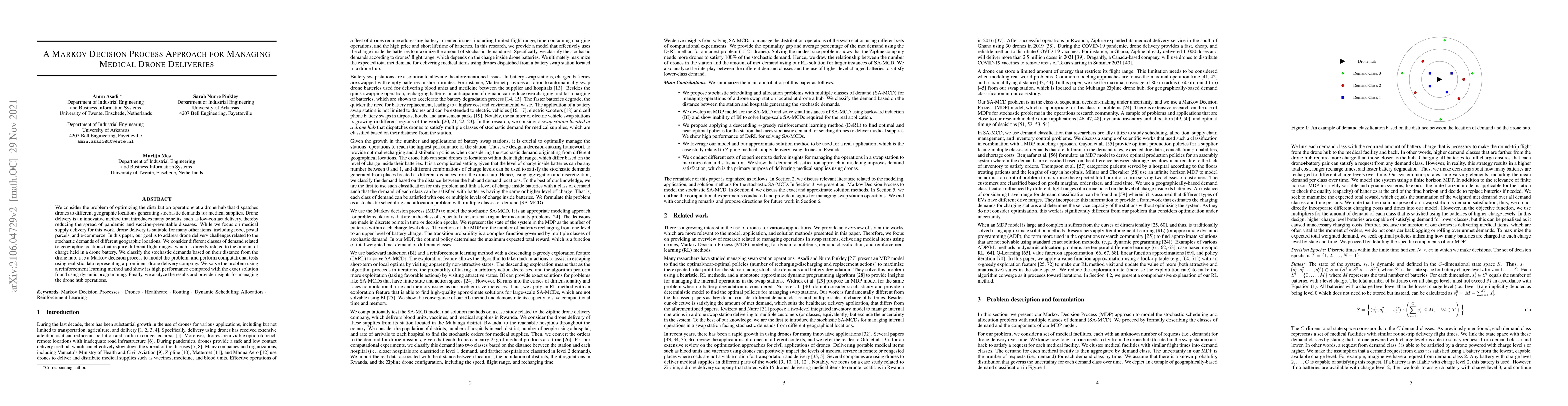 This paper optimizes drone delivery operations using a Markov decision process to manage stochastic demands for medical supplies, addressing challenges related to varying geographic distances and battery capacities. It employs reinforcement learning to achieve high performance compared to dynamic programming, providing insights for drone hub management.