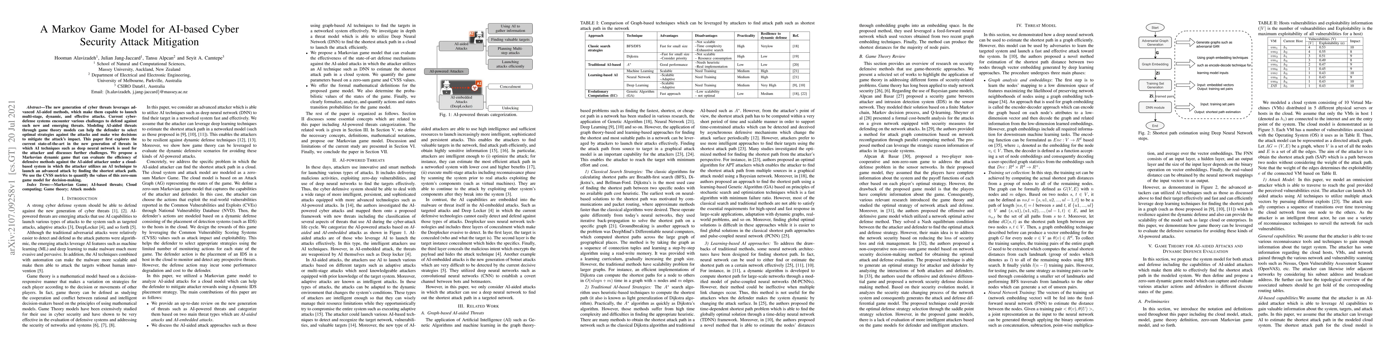 The new generation of cyber threats leverages advanced AI-aided methods, which make them capable to launch multi-stage, dynamic, and effective attacks. Current cyber-defense systems encounter various challenges to defend against such new and emerging threats. Modeling AI-aided threats through game theory models can help the defender to select optimal strategies against the attacks and make wise decisions to mitigate the attack's impact. This paper first explores the current state-of-the-art in the new generation of threats in which AI techniques such as deep neural network is used for the attacker and discusses further challenges. We propose a Markovian dynamic game that can evaluate the efficiency of defensive methods against the AI-aided attacker under a cloud-based system in which the attacker utilizes an AI technique to launch an advanced attack by finding the shortest attack path. We use the CVSS metrics to quantify the values of this zero-sum game model for decision-making.