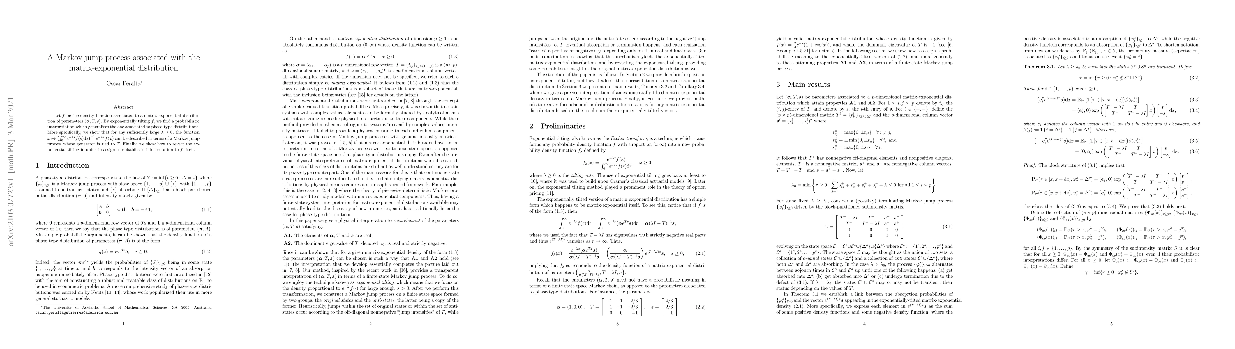 This paper explores the probabilistic interpretation of a matrix-exponential distribution through exponential tilting, revealing a Markov jump process linked to the distribution's parameters. It demonstrates how to revert the tilting to provide a probabilistic interpretation of the original distribution.