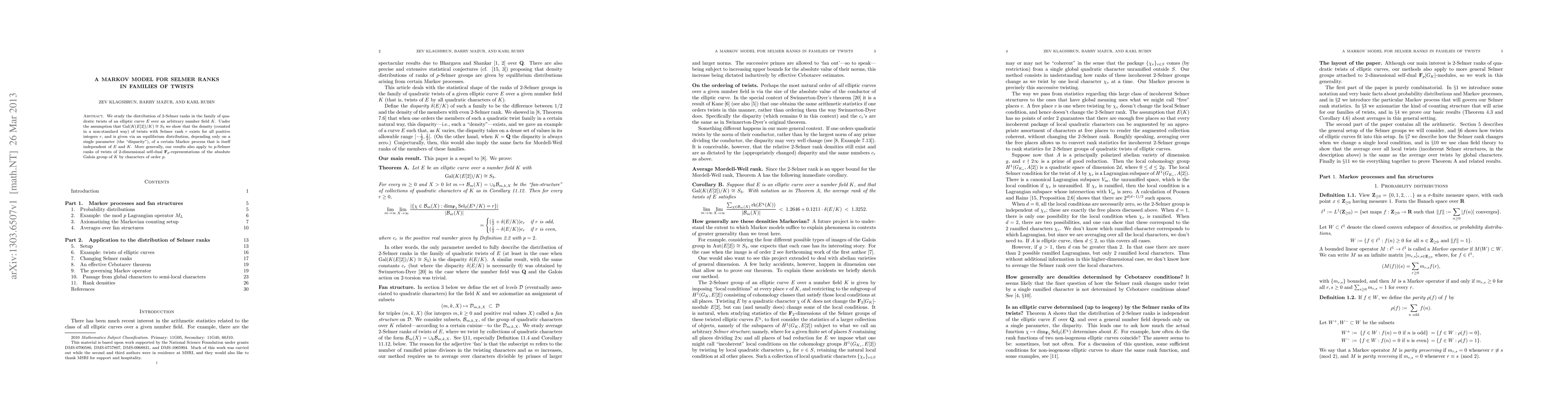 This paper investigates the distribution of 2-Selmer ranks in quadratic twists of elliptic curves over number fields, demonstrating that the density of twists with a given rank follows an equilibrium distribution from a Markov process, independent of the specific curve and field. The results extend to p-Selmer ranks of self-dual representations of Galois groups.