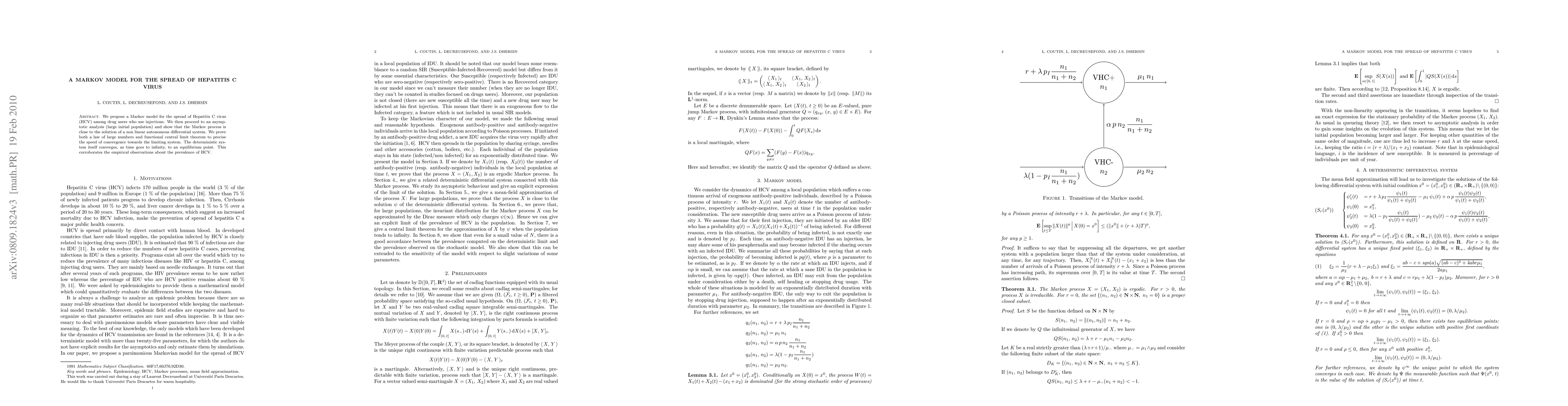 This research introduces a Markov model to study Hepatitis C spread among drug users via injections. It proves the model's convergence to a deterministic differential system, confirming empirical HCV prevalence observations through mathematical theorems.