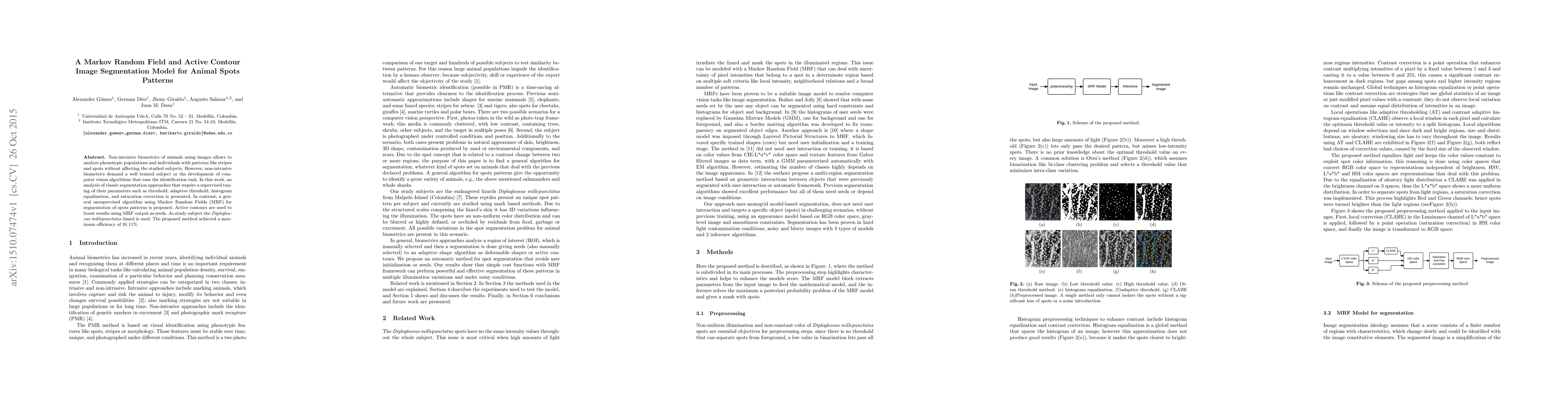 This paper proposes an unsupervised Markov Random Field-based image segmentation model to identify animal spots patterns without affecting the subjects. The proposed method achieved a maximum efficiency of 91.11% using the Diploglossus millepunctatus lizard as study subject.