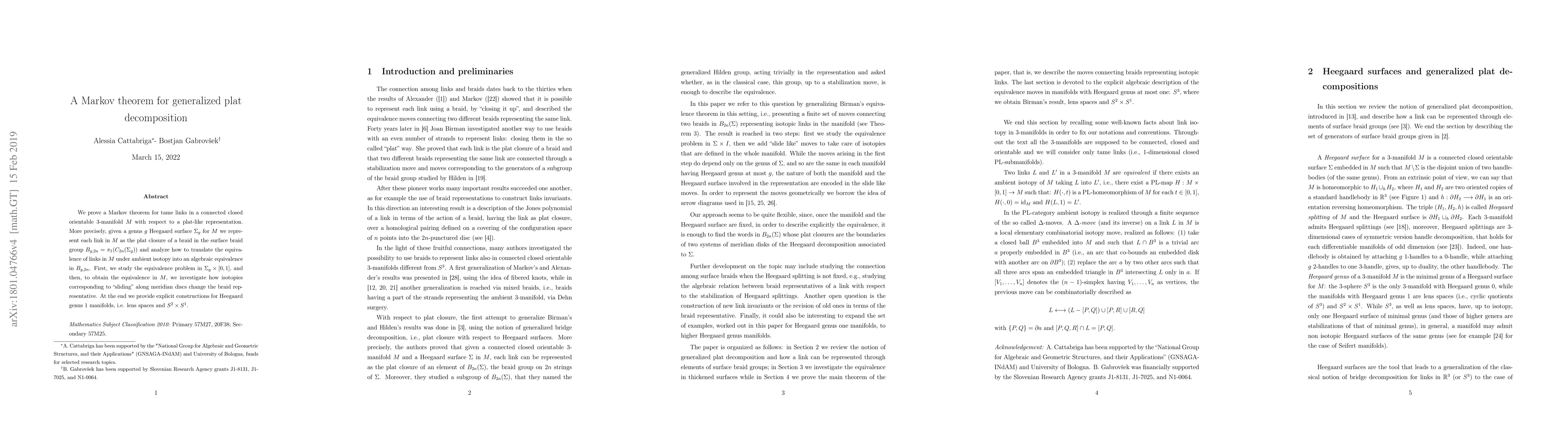 This paper proves a Markov theorem for tame links in 3-manifolds using plat-like representations, showing how equivalence of links under ambient isotopy translates to algebraic equivalence in surface braid groups. It provides explicit constructions for genus 1 Heegaard manifolds, including lens spaces and $S^2\times S^1$.