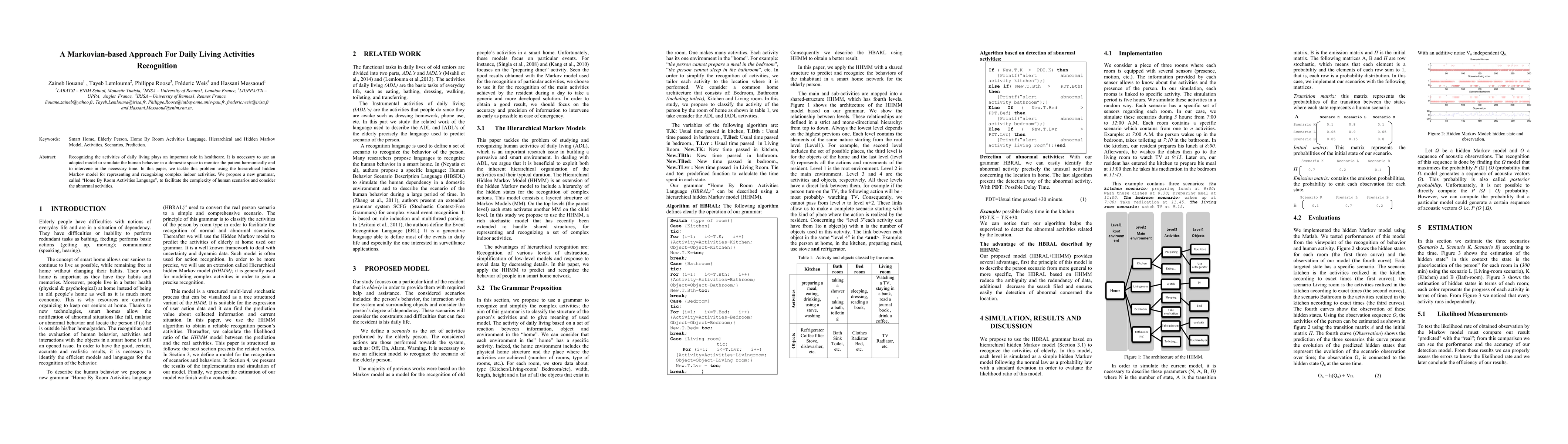 This paper proposes a hierarchical hidden Markov model to recognize complex daily living activities using a new grammar, "Home By Room Activities Language," to simulate human behavior in domestic environments and detect abnormal activities for timely intervention.
