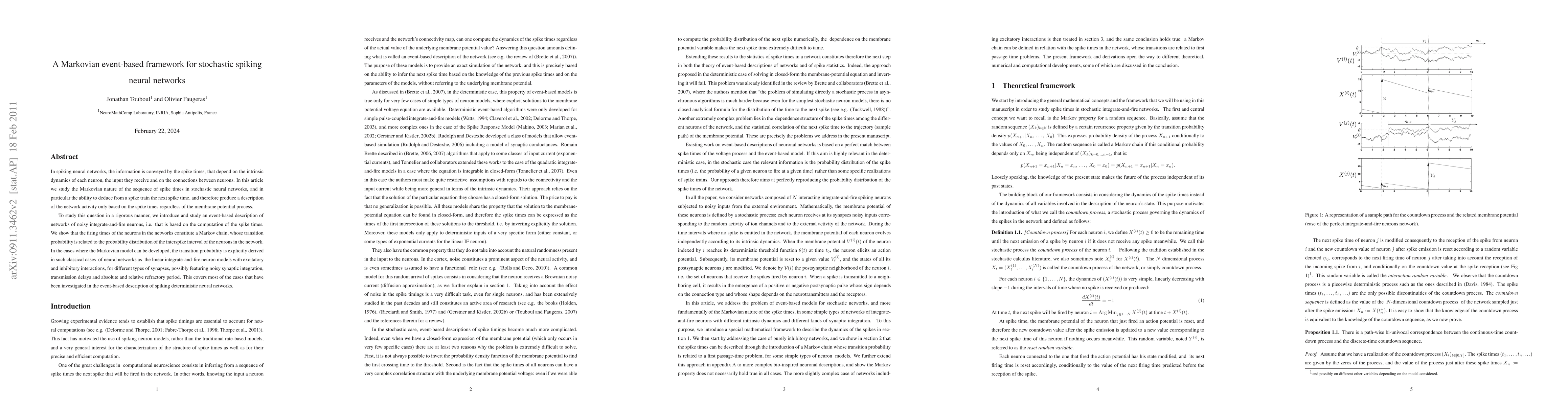 This paper introduces a new framework for understanding spike times in neural networks using Markovian models, allowing researchers to predict the next spike time without knowing the underlying membrane potential process.