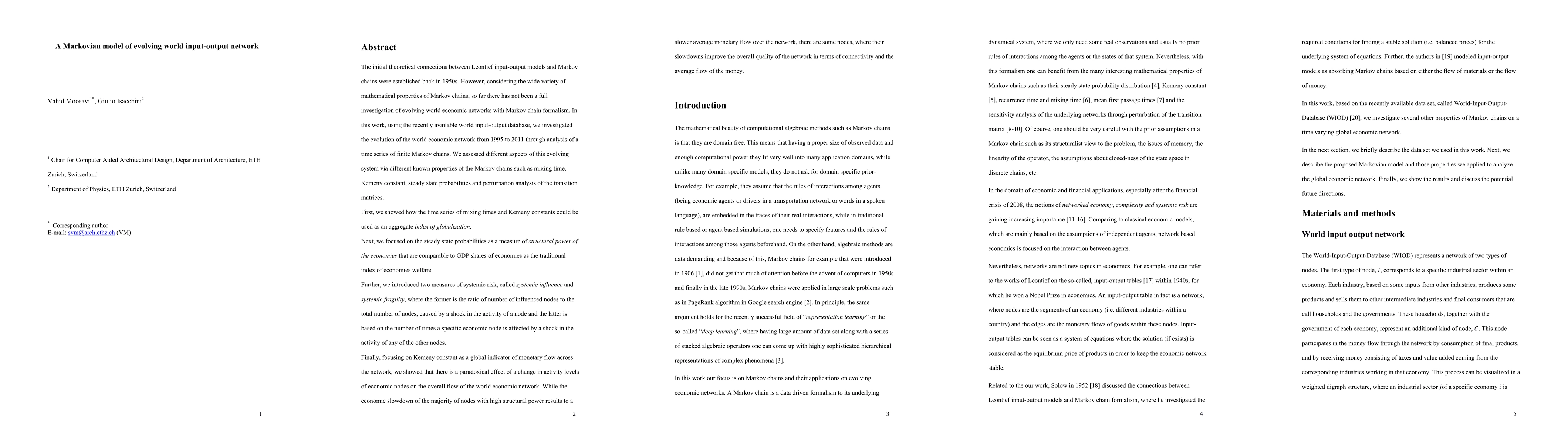 The initial theoretical connections between Leontief input-output models and Markov chains were established back in 1950s. However, considering the wide variety of mathematical properties of Markov chains, there has not been a full investigation of evolving world economic networks with Markov chain formalism. Using the recently available world input-output database, we modeled the evolution of the world economic network from 1995 to 2011 through analysis of a series of finite Markov chains. We assessed different aspects of this evolving system via different properties of the Markov chains such as mixing time, Kemeny constant, steady state probabilities and perturbation analysis of the transition matrices. First, we showed how the time series of mixing times and Kemeny constants could be used as an aggregate index of globalization. Next, we focused on the steady state probabilities as a measure of structural power of the economies that are comparable to GDP shares of economies as the traditional index of economies. Further, we introduced two measures of systemic risk, called systemic influence and systemic fragility, where the former is the ratio of number of influenced nodes to the total number of nodes, caused by a shock in the activity of a node and the latter is based on the number of times a specific economic node is affected by a shock in the activity of any of the other nodes. Finally, focusing on Kemeny constant as a global indicator of monetary flow across the network, we showed that there is a paradoxical effect of a change in activity levels of economic nodes on the overall flow of the network. While the economic slowdown of the majority of nodes with high structural power results to a slower average monetary flow over the network, there are some nodes, where their slowdowns improve the overall quality of the network in terms of connectivity and the average monetary flow.