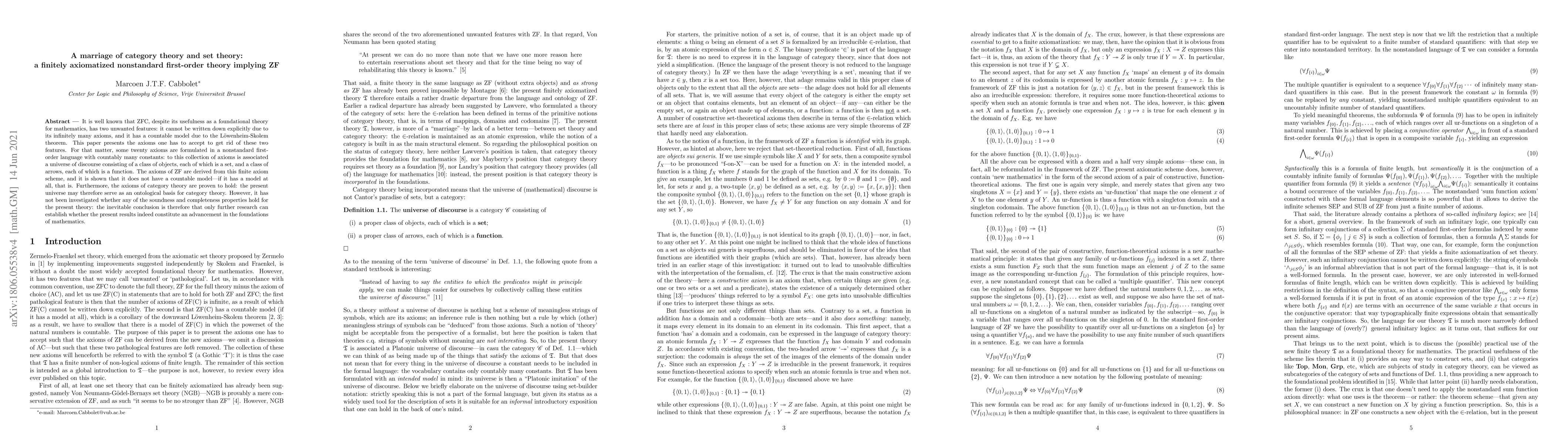 It is well known that ZFC, despite its usefulness as a foundational theory for mathematics, has two unwanted features: it cannot be written down explicitly due to its infinitely many axioms, and it has a countable model due to the L\"{o}wenheim-Skolem theorem. This paper presents the axioms one has to accept to get rid of these two features. For that matter, some twenty axioms are formulated in a nonstandard first-order language with countable many constants: to this collection of axioms is associated a universe of discourse consisting of a class of objects, each of which is a set, and a class of arrows, each of which is a function. The axioms of ZF are derived from this finite axiom scheme, and it is shown that it does not have a countable model--if it has a model at all, that is. Furthermore, the axioms of category theory are proven to hold: the present universe may therefore serve as an ontological basis for category theory. However, it has not been investigated whether any of the soundness and completeness properties hold for the present theory: the inevitable conclusion is therefore that only further research can establish whether the present results indeed constitute an advancement in the foundations of mathematics.