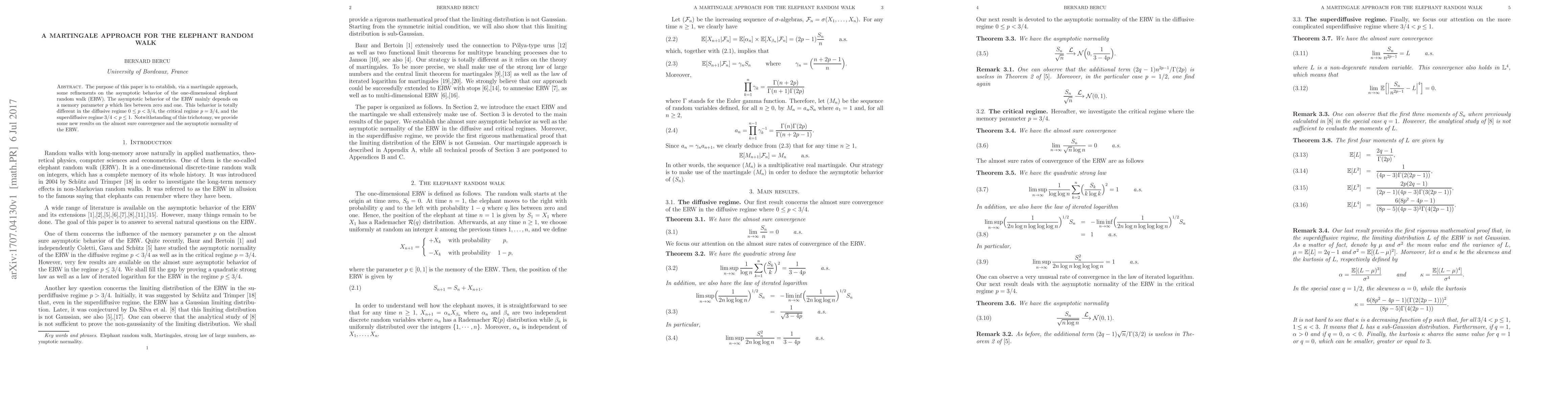 A martingale approach refines the asymptotic behavior of the elephant random walk, revealing new results on almost sure convergence and asymptotic normality for different regimes of memory parameter $p$. The research provides insights into the ERW's behavior in diffusive, critical, and superdiffusive regimes.