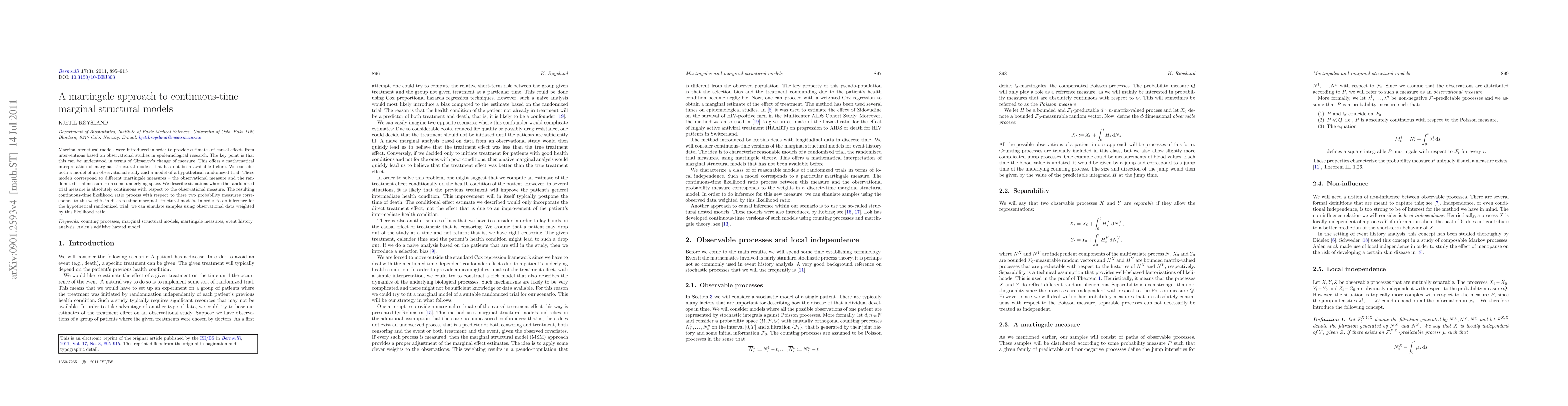 The paper introduces a martingale-based framework for continuous-time marginal structural models, linking them to Girsanov's change of measure and providing conditions for absolute continuity between observational and randomized trial measures.