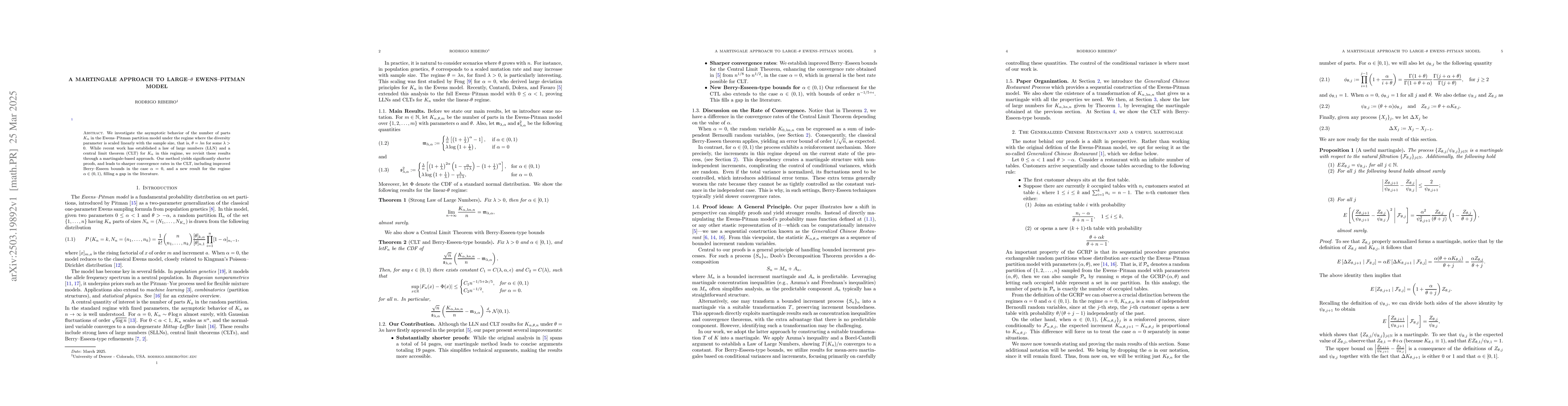 The paper employs a martingale-based approach to revisit the asymptotic behavior of the number of parts $K_n$ in the Ewens--Pitman partition model under the regime where the diversity parameter $\theta$ is scaled linearly with the sample size, i.e., $\theta = \lambda n$ for $\lambda > 0$.