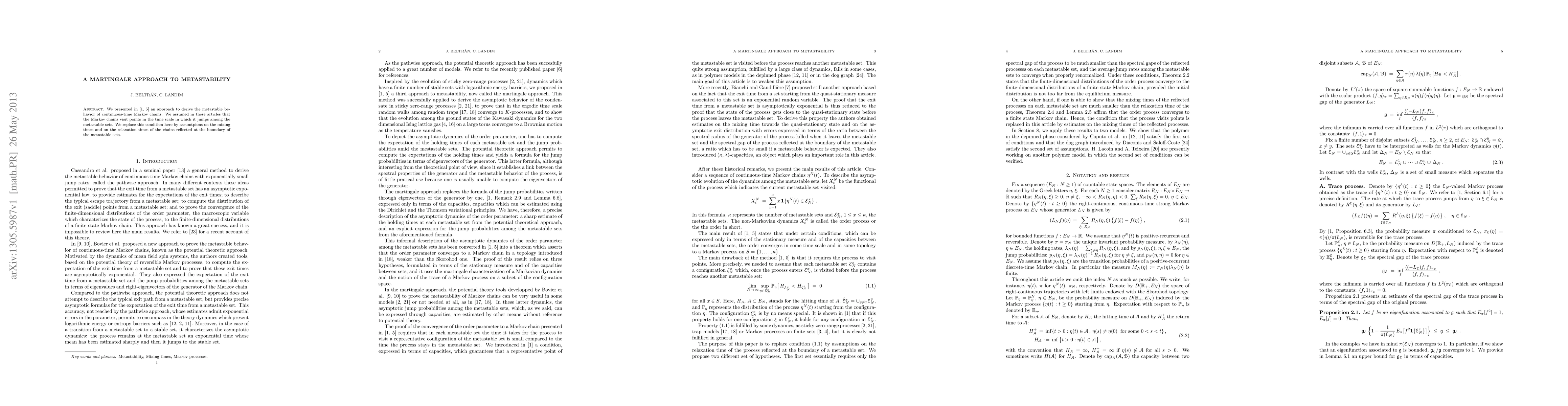 We presented in \cite{bl2,bl7} an approach to derive the metastable behavior of continuous-time Markov chains. We assumed in these articles that the Markov chains visit points in the time scale in which it jumps among the metastable sets. We replace this condition here by assumtpions on the mixing times and on the relaxation times of the chains reflected at the boundary of the metastable sets.