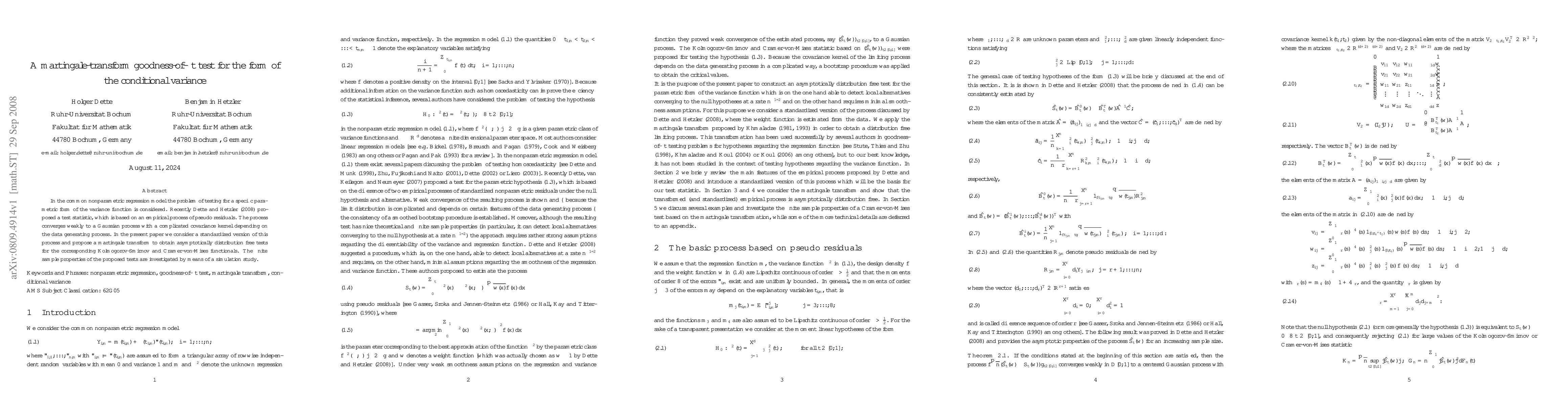 This paper proposes a new statistical test to determine if a nonparametric regression model's variance follows a specific form, using a martingale-transform approach for distribution-free tests. A simulation study investigates the test's finite sample properties.