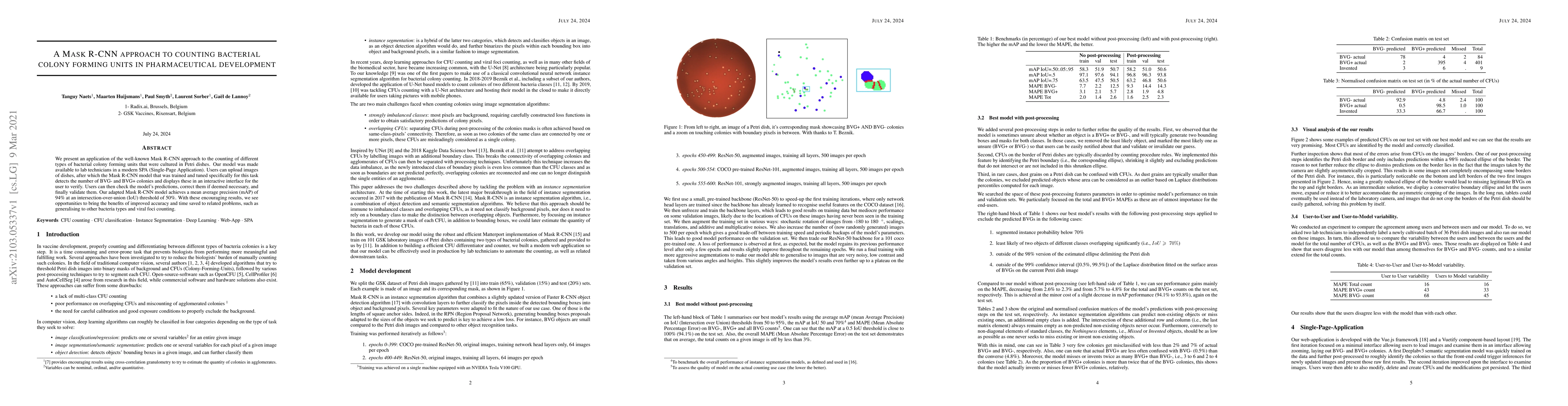 We present an application of the well-known Mask R-CNN approach to the counting of different types of bacterial colony forming units that were cultured in Petri dishes. Our model was made available to lab technicians in a modern SPA (Single-Page Application). Users can upload images of dishes, after which the Mask R-CNN model that was trained and tuned specifically for this task detects the number of BVG- and BVG+ colonies and displays these in an interactive interface for the user to verify. Users can then check the model's predictions, correct them if deemed necessary, and finally validate them. Our adapted Mask R-CNN model achieves a mean average precision (mAP) of 94\% at an intersection-over-union (IoU) threshold of 50\%. With these encouraging results, we see opportunities to bring the benefits of improved accuracy and time saved to related problems, such as generalising to other bacteria types and viral foci counting.