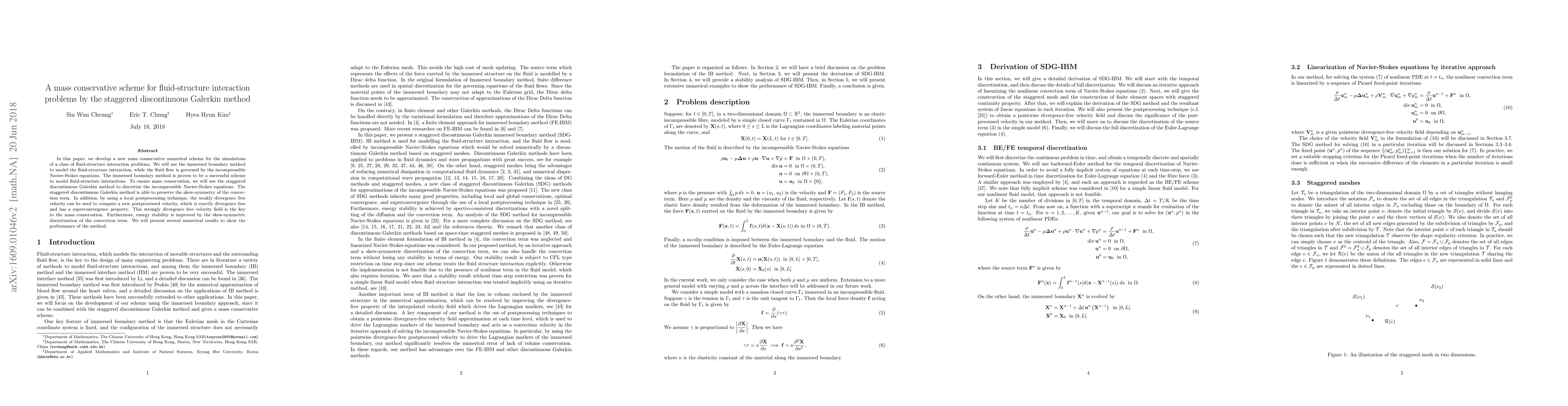 In this paper, we develop a new mass conservative numerical scheme for the simulations of a class of fluid-structure interaction problems. We will use the immersed boundary method to model the fluid-structure interaction, while the fluid flow is governed by the incompressible Navier-Stokes equations. The immersed boundary method is proven to be a successful scheme to model fluid-structure interactions. To ensure mass conservation, we will use the staggered discontinuous Galerkin method to discretize the incompressible Navier-Stokes equations. The staggered discontinuous Galerkin method is able to preserve the skew-symmetry of the convection term. In addition, by using a local postprocessing technique, the weakly divergence free velocity can be used to compute a new postprocessed velocity, which is exactly divergence free and has a superconvergence property. This strongly divergence free velocity field is the key to the mass conservation. Furthermore, energy stability is improved by the skew-symmetric discretization of the convection term. We will present several numerical results to show the performance of the method.