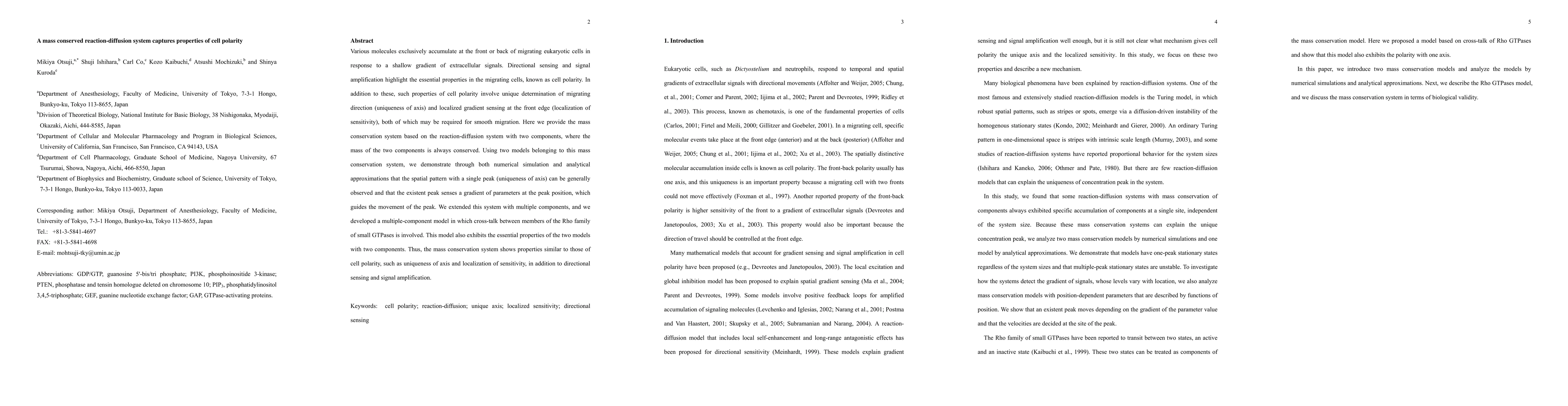 Various molecules exclusively accumulate at the front or back of migrating eukaryotic cells in response to a shallow gradient of extracellular signals. Directional sensing and signal amplification highlight the essential properties in the migrating cells, known as cell polarity. In addition to these, such properties of cell polarity involve unique determination of migrating direction (uniqueness of axis) and localized gradient sensing at the front edge (localization of sensitivity), both of which may be required for smooth migration. Here we provide the mass conservation system based on the reaction-diffusion system with two components, where the mass of the two components is always conserved. Using two models belonging to this mass conservation system, we demonstrate through both numerical simulation and analytical approximations that the spatial pattern with a single peak (uniqueness of axis) can be generally observed and that the existent peak senses a gradient of parameters at the peak position, which guides the movement of the peak. We extended this system with multiple components, and we developed a multiple-component model in which cross-talk between members of the Rho family of small GTPases is involved. This model also exhibits the essential properties of the two models with two components. Thus, the mass conservation system shows properties similar to those of cell polarity, such as uniqueness of axis and localization of sensitivity, in addition to directional sensing and signal amplification.