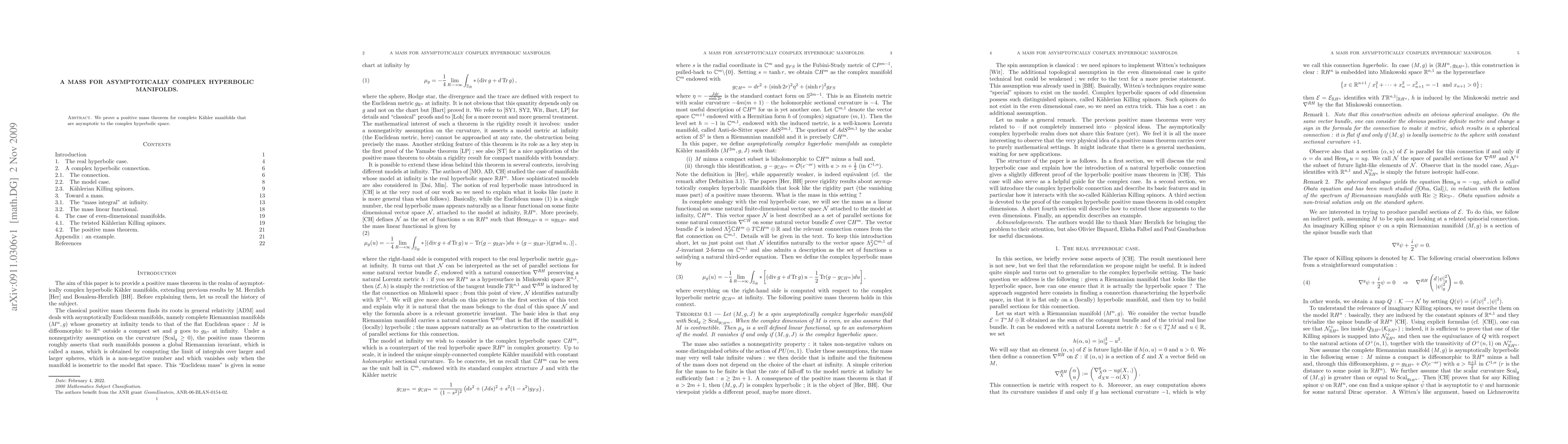 Summary: This paper establishes a positive mass theorem for complete Kähler manifolds asymptotically approaching complex hyperbolic space, demonstrating that such manifolds possess positive mass.