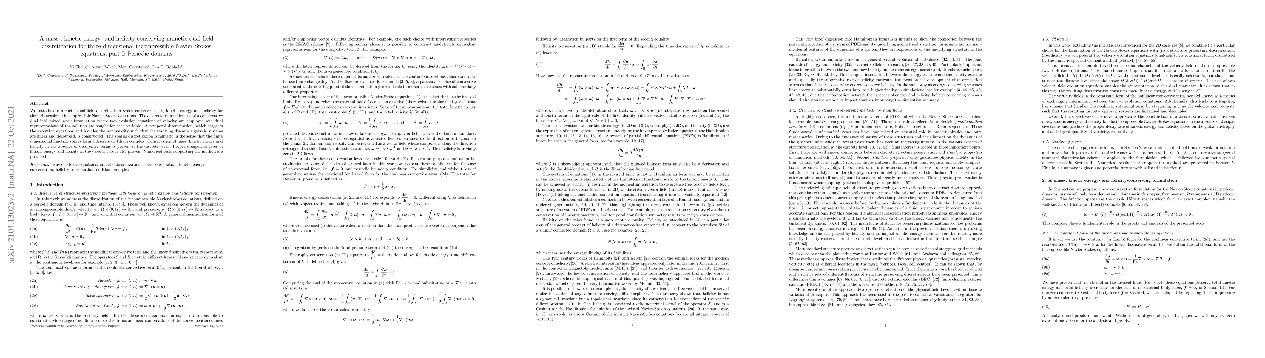 This paper presents a mimetic dual-field discretization conserving mass, kinetic energy, and helicity for the three-dimensional incompressible Navier-Stokes equations in periodic domains. The method employs a conservative dual-field mixed weak formulation and a staggered temporal discretization to ensure linear and decoupled discrete algebraic systems.