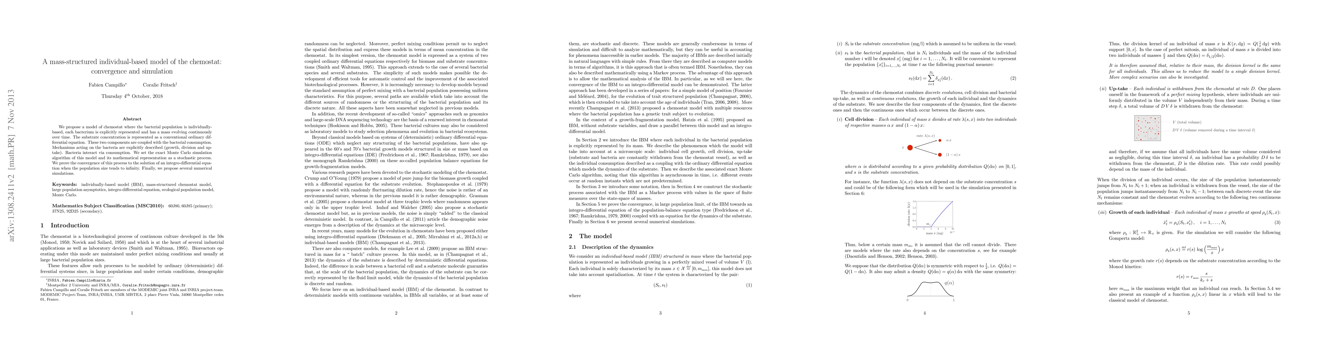 We propose a model of chemostat where the bacterial population is individually-based, each bacterium is explicitly represented and has a mass evolving continuously over time. The substrate concentration is represented as a conventional ordinary differential equation. These two components are coupled with the bacterial consumption. Mechanisms acting on the bacteria are explicitly described (growth, division and up-take). Bacteria interact via consumption. We set the exact Monte Carlo simulation algorithm of this model and its mathematical representation as a stochastic process. We prove the convergence of this process to the solution of an integro-differential equation when the population size tends to infinity. Finally, we propose several numerical simulations.