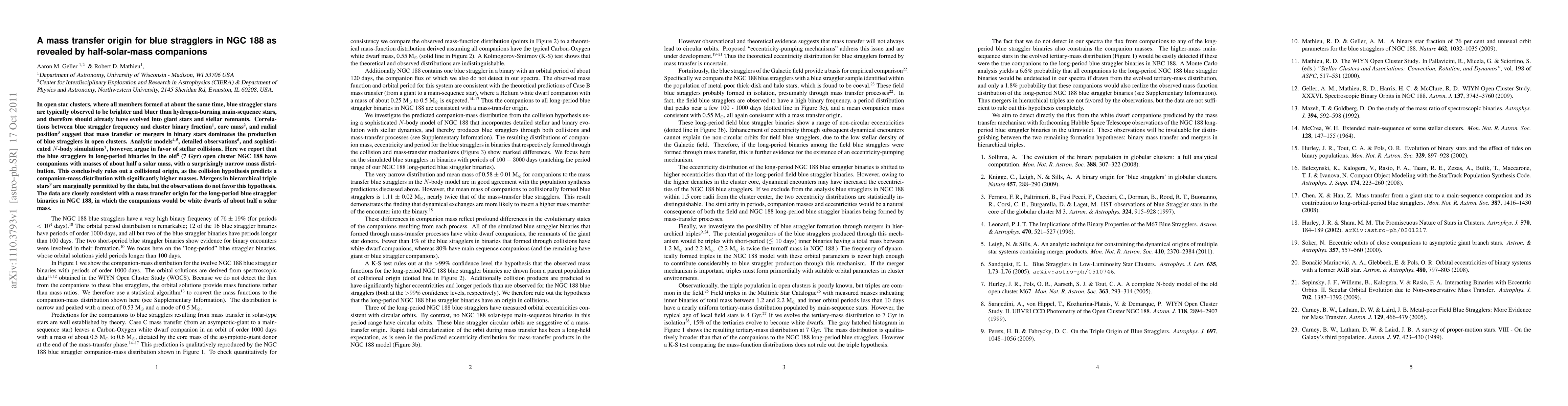 This paper reveals that blue stragglers in the open cluster NGC 188 are likely formed through mass transfer in long-period binary systems, as evidenced by their half-solar-mass companions, ruling out a collisional origin. The findings support a mass transfer mechanism over mergers in hierarchical triple systems.