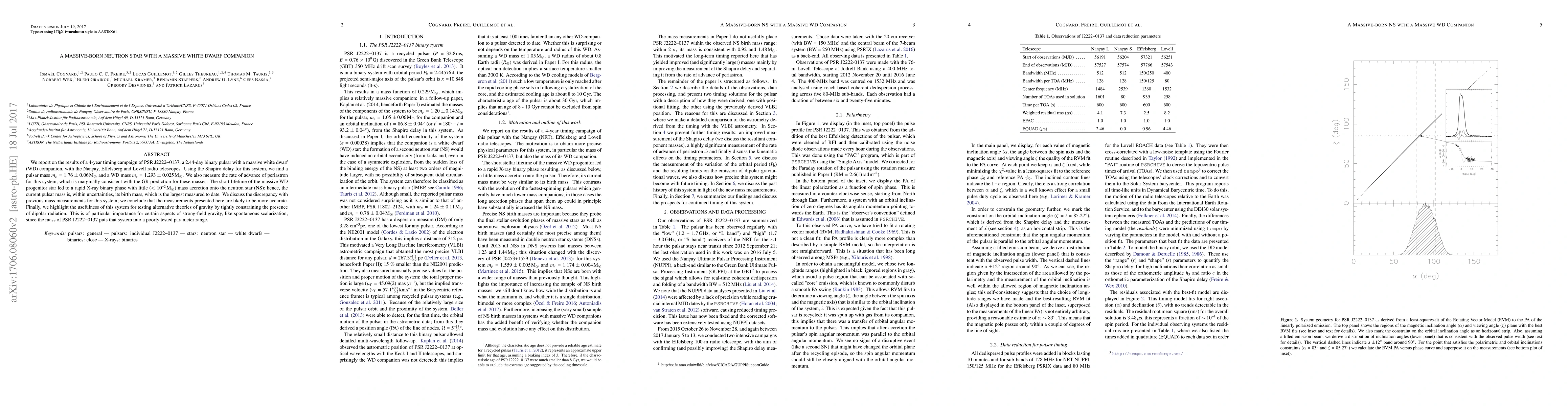 We report on the results of a 4-year timing campaign of PSR~J2222$-0137$, a 2.44-day binary pulsar with a massive white dwarf (WD) companion, with the Nan\c{c}ay, Effelsberg and Lovell radio telescopes. Using the Shapiro delay for this system, we find a pulsar mass $m_{p}=1.76,\pm\,0.06,M_\odot$ and a WD mass $m_{c}\,=\,1.293\,\pm\,0.025\, M_\odot$. We also measure the rate of advance of periastron for this system, which is marginally consistent with the GR prediction for these masses. The short lifetime of the massive WD progenitor star led to a rapid X-ray binary phase with little ($< \, 10^{-2} \, M_\odot$) mass accretion onto the neutron star (NS); hence, the current pulsar mass is, within uncertainties, its birth mass; the largest measured to date. We discuss the discrepancy with previous mass measurements for this system; we conclude that the measurements presented here are likely to be more accurate. Finally, we highlight the usefulness of this system for testing alternative theories of gravity by tightly constraining the presence of dipolar radiation. This is of particular importance for certain aspects of strong-field gravity, like spontaneous scalarization, since the mass of PSR~J2222$-0137$ puts that system into a poorly tested parameter range.