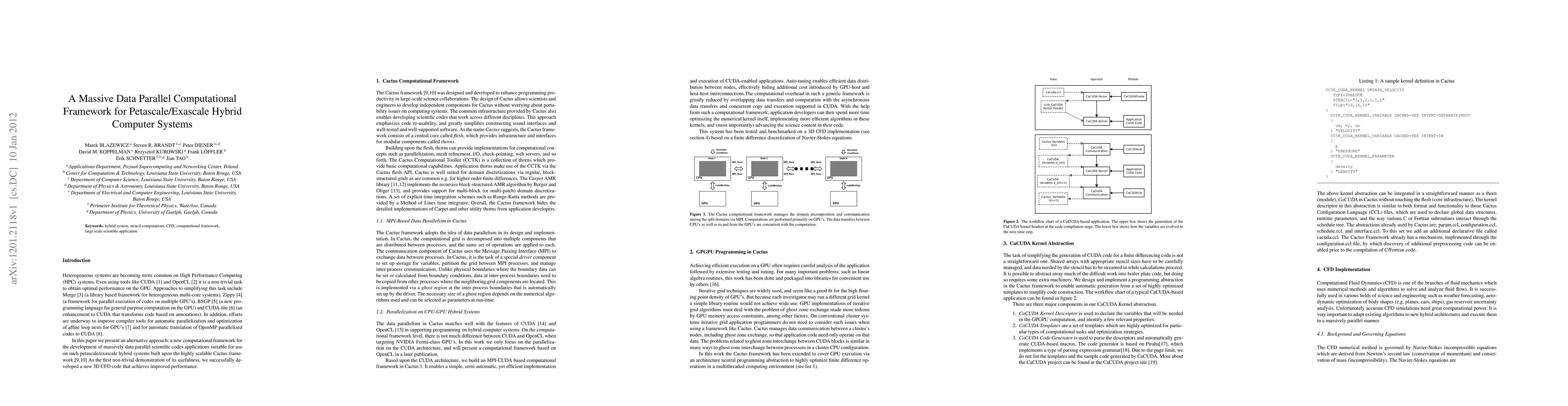 Heterogeneous systems are becoming more common on High Performance Computing (HPC) systems. Even using tools like CUDA and OpenCL it is a non-trivial task to obtain optimal performance on the GPU. Approaches to simplifying this task include Merge (a library based framework for heterogeneous multi-core systems), Zippy (a framework for parallel execution of codes on multiple GPUs), BSGP (a new programming language for general purpose computation on the GPU) and CUDA-lite (an enhancement to CUDA that transforms code based on annotations). In addition, efforts are underway to improve compiler tools for automatic parallelization and optimization of affine loop nests for GPUs and for automatic translation of OpenMP parallelized codes to CUDA. In this paper we present an alternative approach: a new computational framework for the development of massively data parallel scientific codes applications suitable for use on such petascale/exascale hybrid systems built upon the highly scalable Cactus framework. As the first non-trivial demonstration of its usefulness, we successfully developed a new 3D CFD code that achieves improved performance.