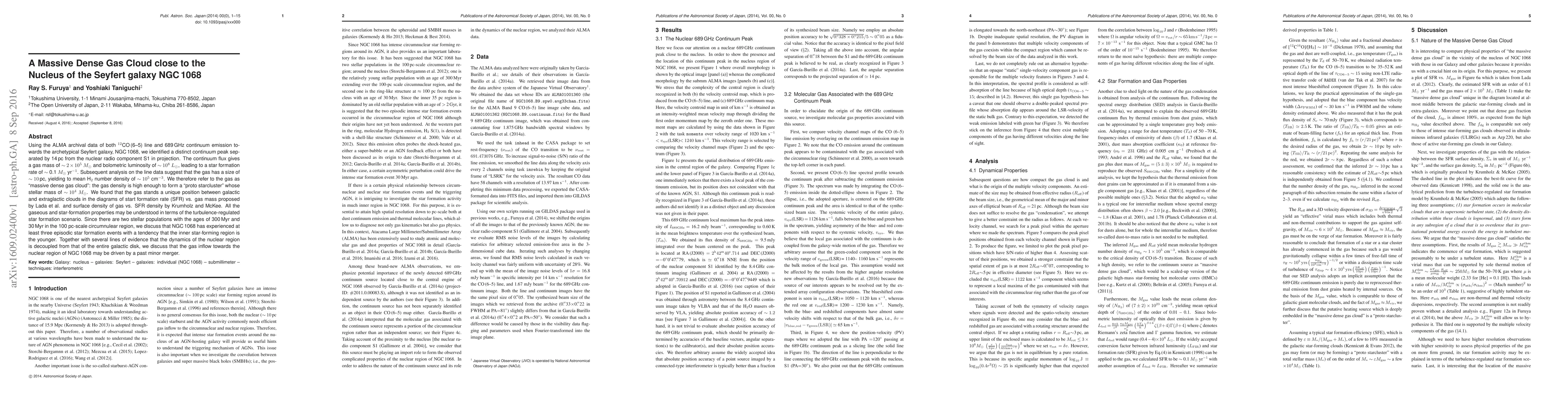 Using the ALMA archival data of both CO(6--5) line and 689 GHz continuum emission towards the archetypical Seyfert galaxy, NGC 1068, we identified a distinct continuum peak separated by 14 pc from the nuclear radio component S1 in projection. The continuum flux gives a gas mass of ~2x10^5 Msun and bolometric luminosity of ~10^8 Lsun, leading to a star formation rate of ~0.1 Msun/yr. Subsequent analysis on the line data suggest that the gas has a size of ~10 pc, yielding to mean H2 number density of ~10^5 cm^{-3}. We therefore refer to the gas as "massive dense gas cloud": the gas density is high enough to form a "proto starcluster" whose stellar mass of ~10^4 Msun. We found that the gas stands a unique position between galactic and extraglactic clouds in the diagrams of start formation rate (SFR) vs. gas mass proposed by Lada et al. and surface density of gas vs. SFR density by Krumholz and McKee. All the gaseous and star-formation properties may be understood in terms of the turbulence-regulated star formation scenario. Since there are two stellar populations with the ages of 300 Myr and 30 Myr in the 100 pc-scale circumnulear region, we discuss that NGC1068 has experienced at least three episodic star formation events with a tendency that the inner star-forming region is the younger. Together with several lines of evidence that the dynamics of the nuclear region is decoupled from that of the entire galactic disk, we discuss that the gas inflow towards the nuclear region of NGC 1068 may be driven by a past minor merger.