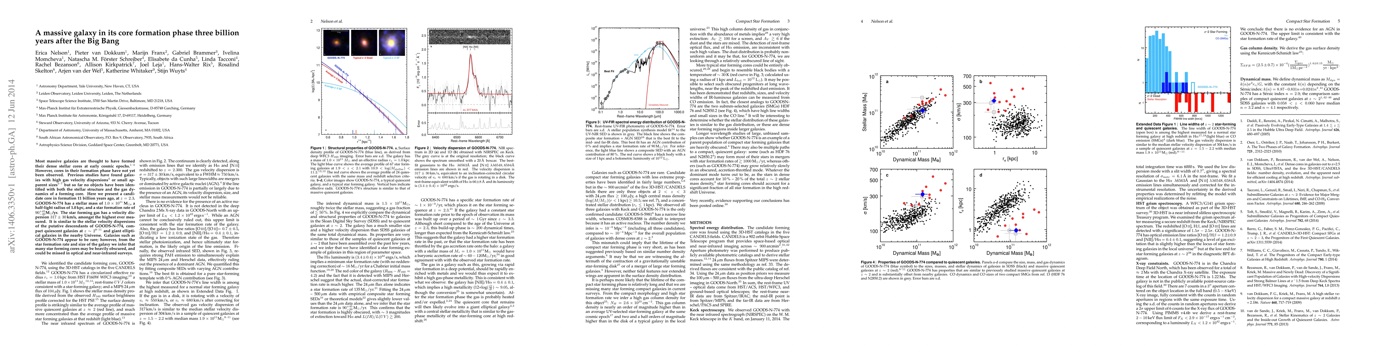 This paper identifies GOODS-N-774, a massive galaxy with a forming stellar core, 11 billion years ago at z=2.3, characterized by a high star formation rate and gas velocity dispersion, suggesting it may be a precursor to compact quiescent galaxies and giant elliptical galaxies. Many star-forming cores may remain undetected due to heavy obscuration.