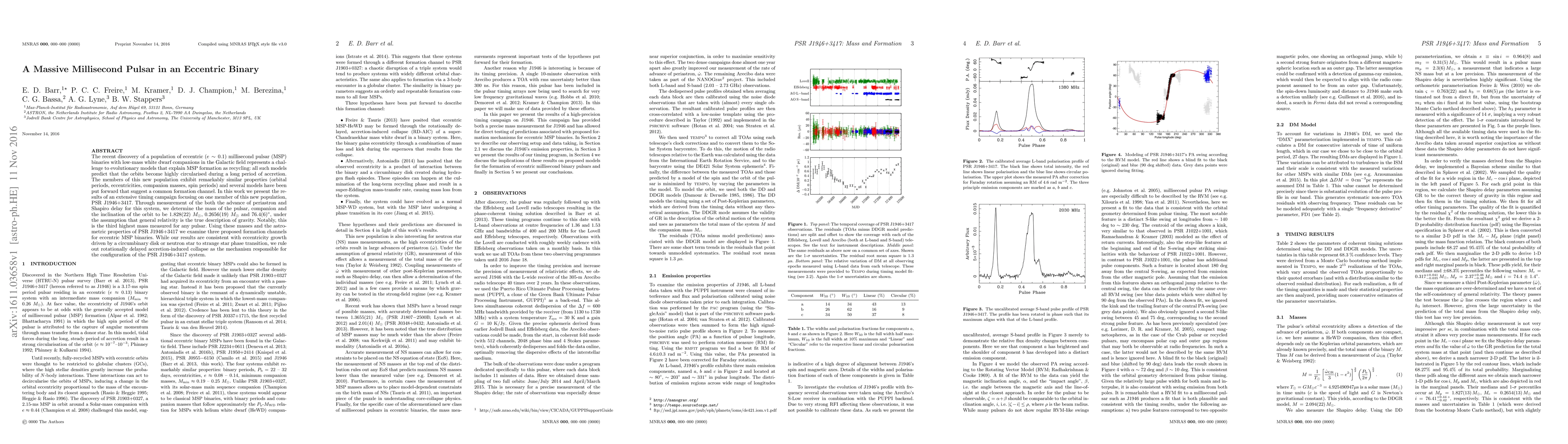 This paper reports the discovery of a massive millisecond pulsar in an eccentric binary system, PSR J1946+3417, challenging the conventional recycling model for MSP formation. The study determines the pulsar and companion masses, finding the pulsar to be one of the highest mass ever measured. The results favor eccentric orbit formation via a circumbinary disk or phase transition, but rule out accretion-induced collapse.