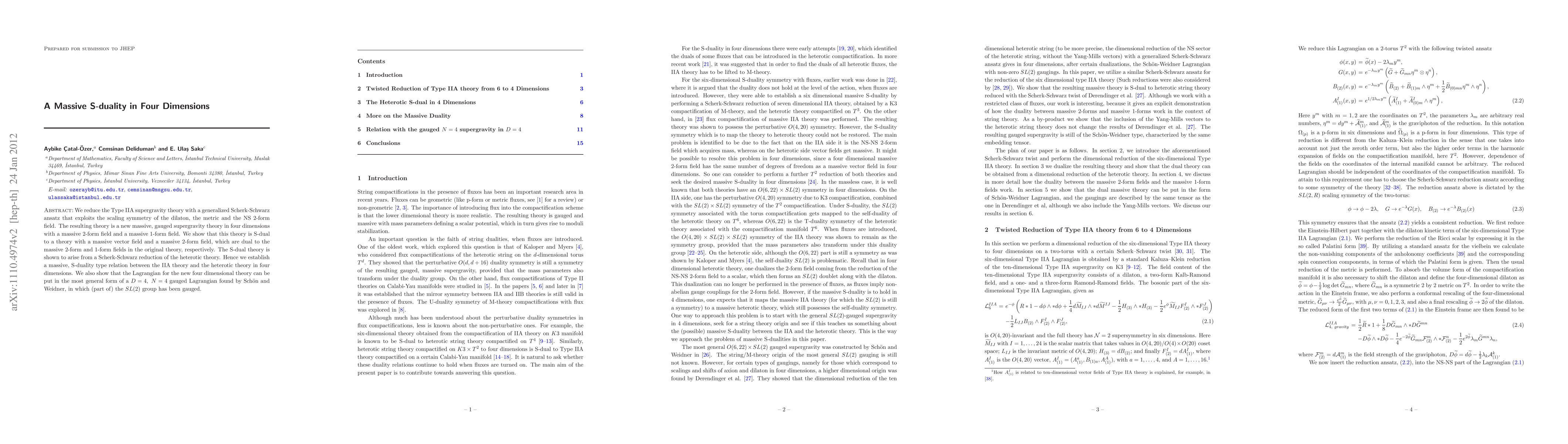 We reduce the Type IIA supergravity theory with a generalized Scherk-Schwarz ansatz that exploits the scaling symmetry of the dilaton, the metric and the NS 2-form field. The resulting theory is a new massive, gauged supergravity theory in four dimensions with a massive 2-form field and a massive 1-form field. We show that this theory is S-dual to a theory with a massive vector field and a massive 2-form field, which are dual to the massive 2-form and 1-form fields in the original theory, respectively. The S-dual theory is shown to arise from a Scherk-Schwarz reduction of the heterotic theory. Hence we establish a massive, S-duality type relation between the IIA theory and the heterotic theory in four dimensions. We also show that the Lagrangian for the new four dimensional theory can be put in the most general form of a D=4, N=4 gauged Lagrangian found by Schon and Weidner, in which (part of) the SL(2) group has been gauged.