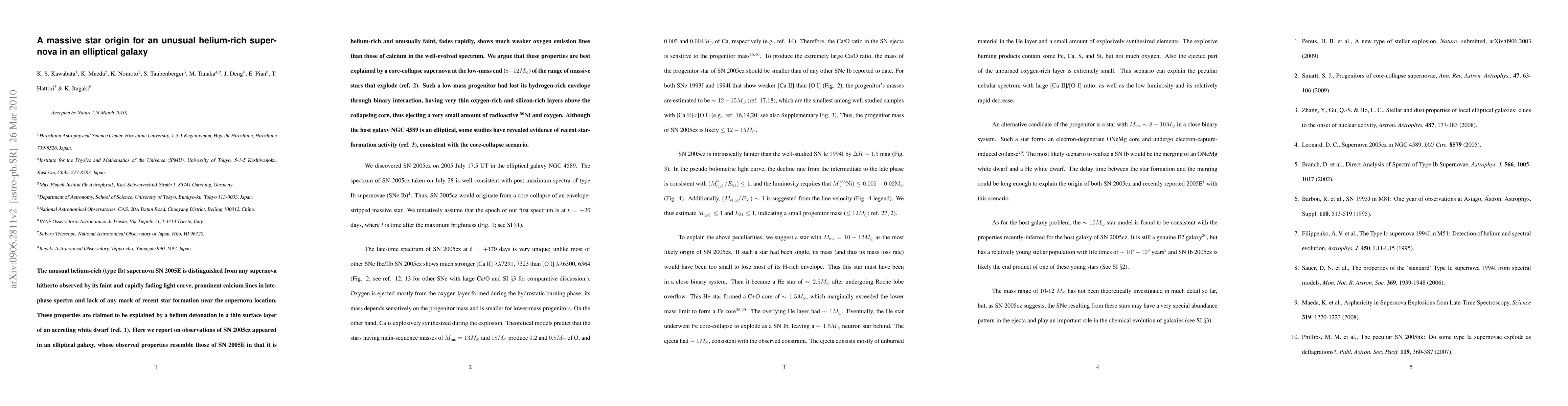 This paper investigates the unusual helium-rich supernova SN 2005E, proposing that its faint and rapidly fading light curve is due to a core-collapse of a low-mass star ($8-12 M_{\odot}$) in an elliptical galaxy. The study finds similar properties in SN 2005cz, suggesting a similar origin and supporting the theory of recent star-formation activity in the host galaxy.