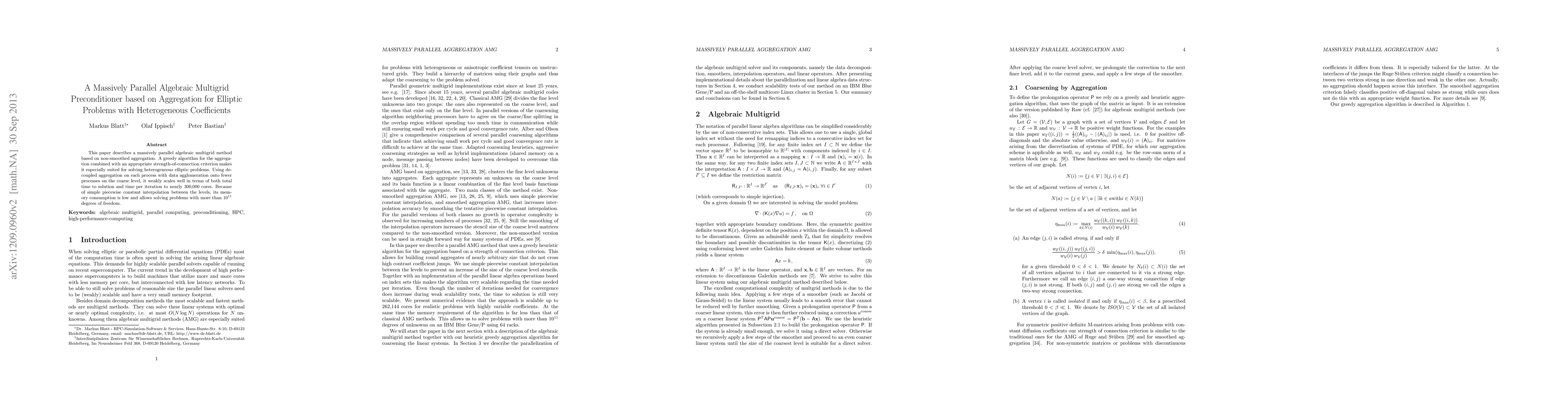 This paper presents a massively parallel algebraic multigrid preconditioner based on non-smoothed aggregation for solving heterogeneous elliptic problems, achieving weak scalability to nearly 300,000 cores with low memory consumption. The method uses a greedy heuristic to detect coefficient changes and optimizes data agglomeration for efficient parallel performance.