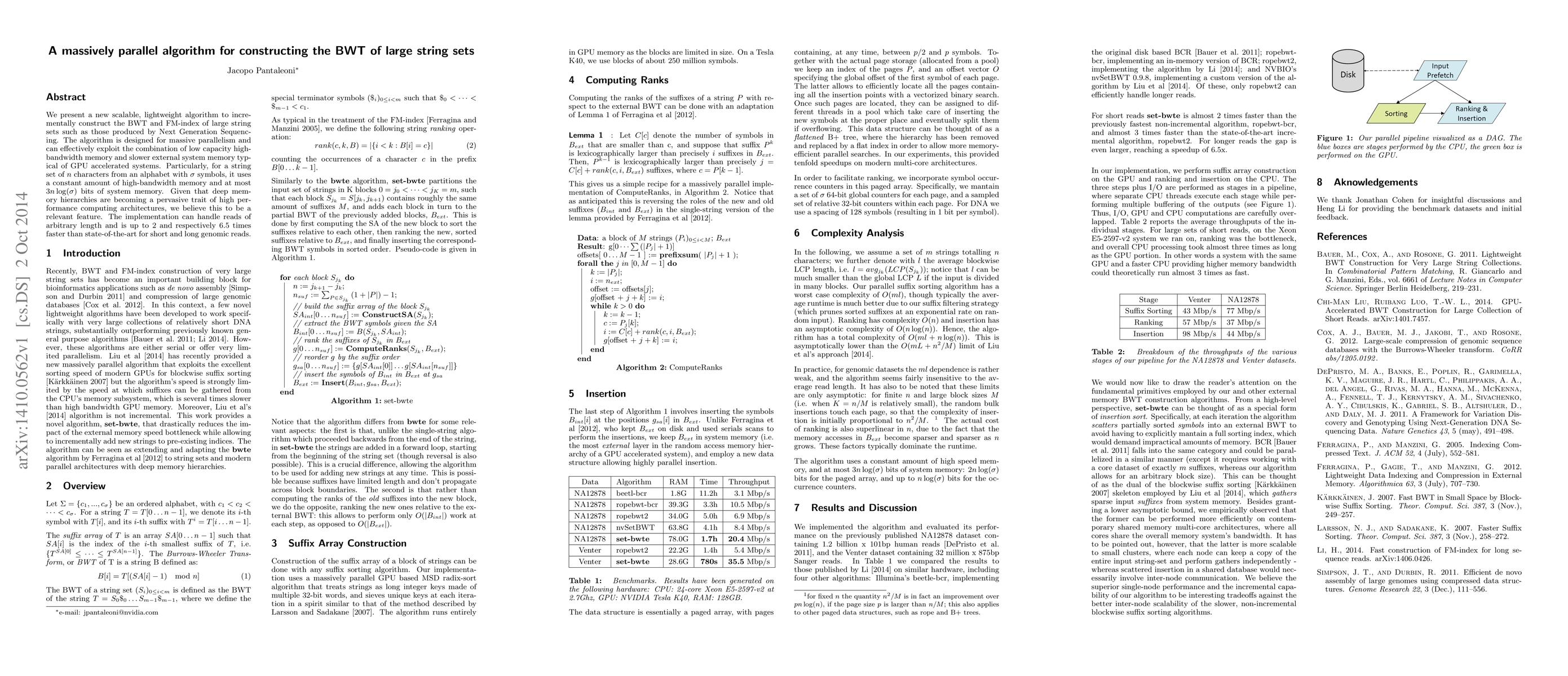 A new algorithm efficiently constructs the Burrows-Wheeler Transform (BWT) of large string sets, achieving significant speedups over existing methods on GPU-accelerated systems.
