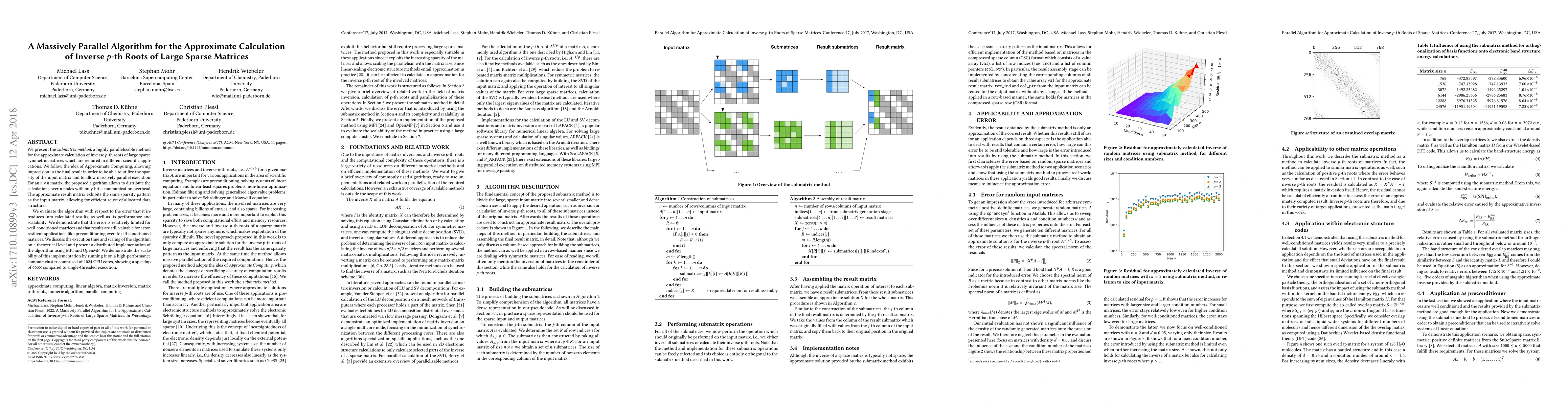 A new algorithm allows for fast and parallel computation of approximate inverse p-th roots of large sparse matrices, with a 665x speedup compared to single-threaded execution.