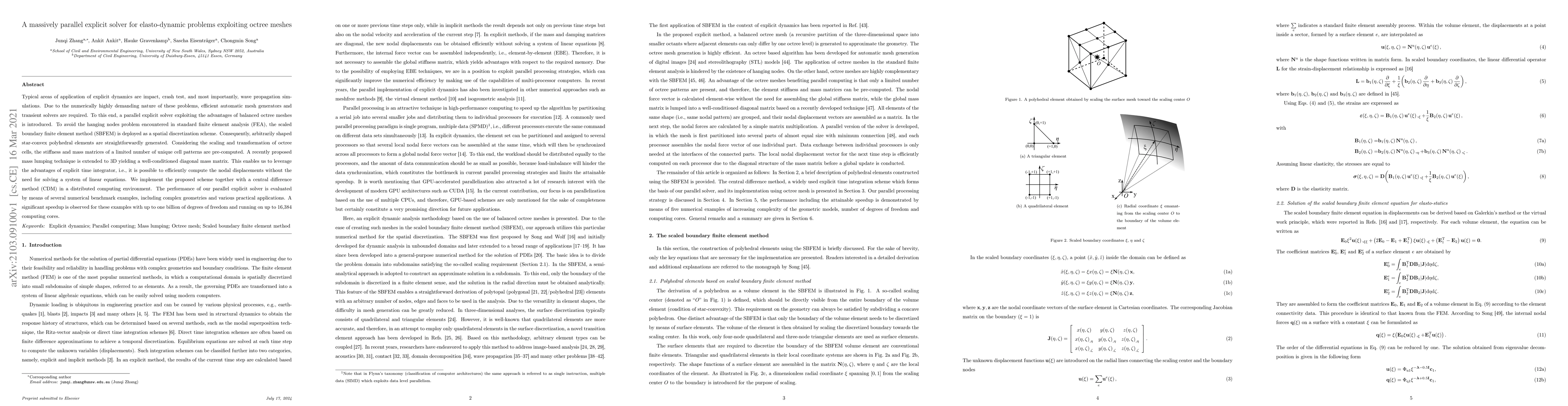 This paper introduces a massively parallel explicit solver for elasto-dynamic problems using balanced octree meshes and the scaled boundary finite element method (SBFEM). The solver efficiently computes nodal displacements without solving linear equations, achieving significant speedup in simulations with complex geometries and up to one billion degrees of freedom.