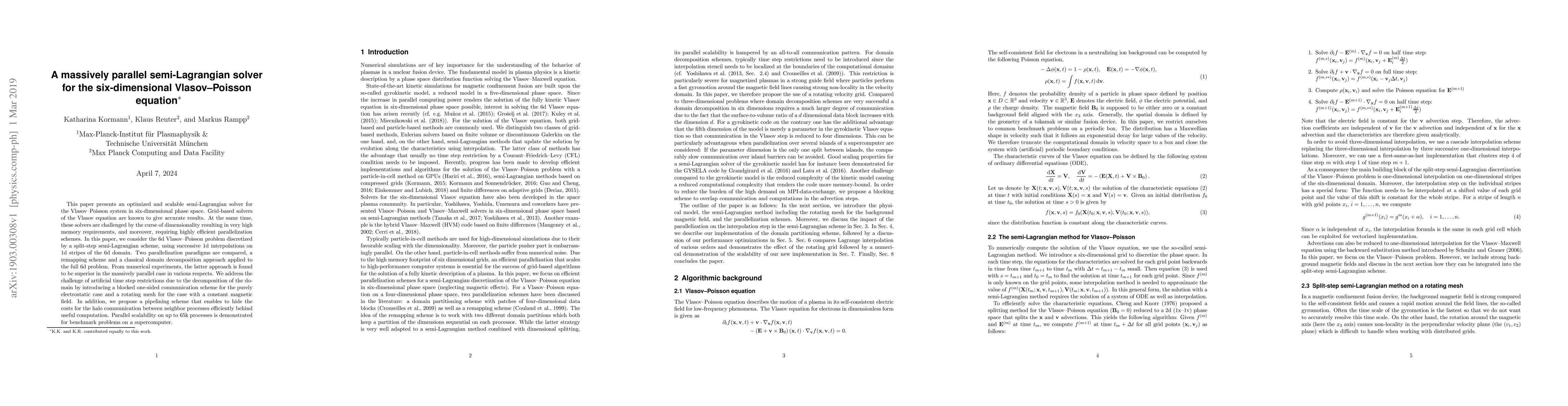 This paper introduces an optimized semi-Lagrangian solver for the six-dimensional Vlasov-Poisson equation, comparing parallelization strategies and demonstrating superior performance of domain decomposition over remapping in massively parallel settings. The study also addresses time step limitations and proposes efficient communication schemes for parallel scalability.