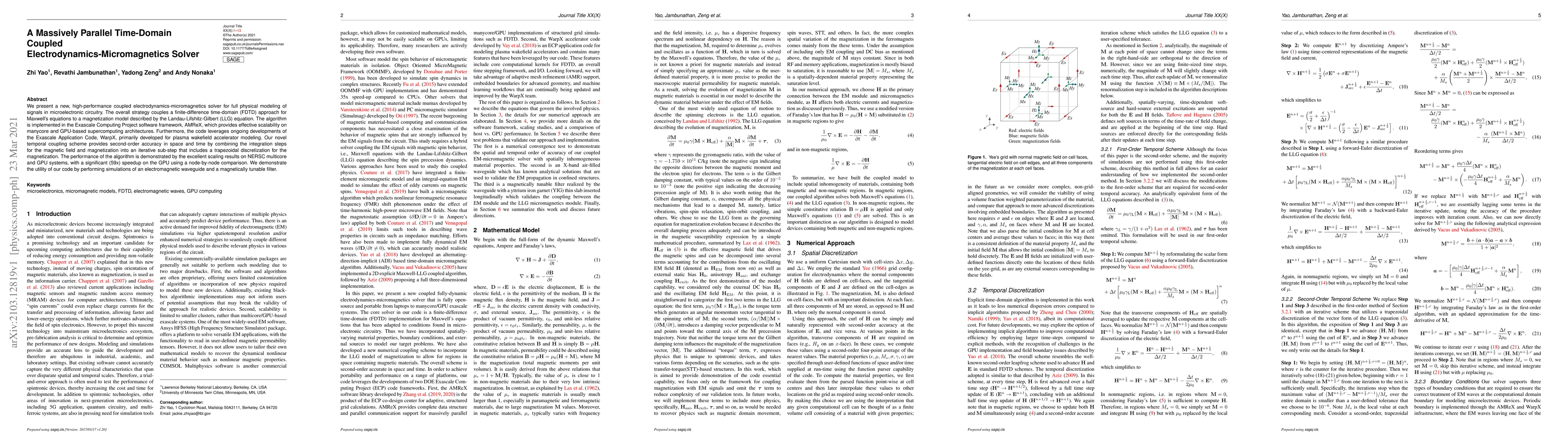 This paper introduces a high-performance solver that combines electrodynamics and micromagnetics for modeling signals in microelectronic circuits, utilizing a finite-difference time-domain approach and Landau-Lifshitz-Gilbert equation. The algorithm scales efficiently on supercomputing architectures, achieving a 59x speedup on GPU systems.