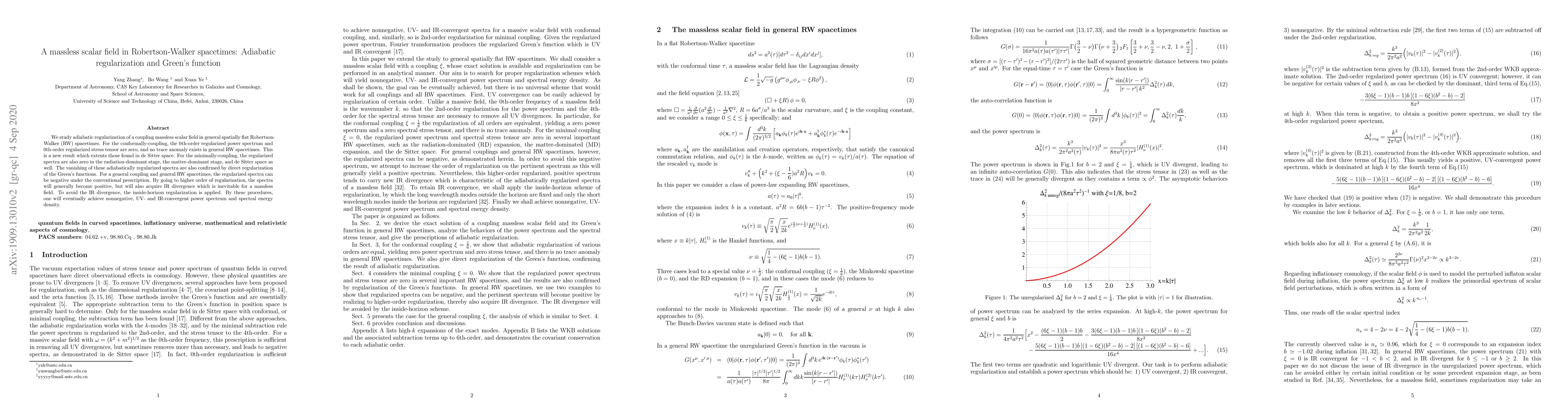 This paper investigates adiabatic regularization for a massless scalar field in spatially flat Robertson-Walker spacetimes, showing that regularized power spectra and stress tensors vanish for conformal and minimal couplings, confirming results from de Sitter space. It also introduces inside-horizon regularization to achieve nonnegative, convergent spectra and stress tensors.