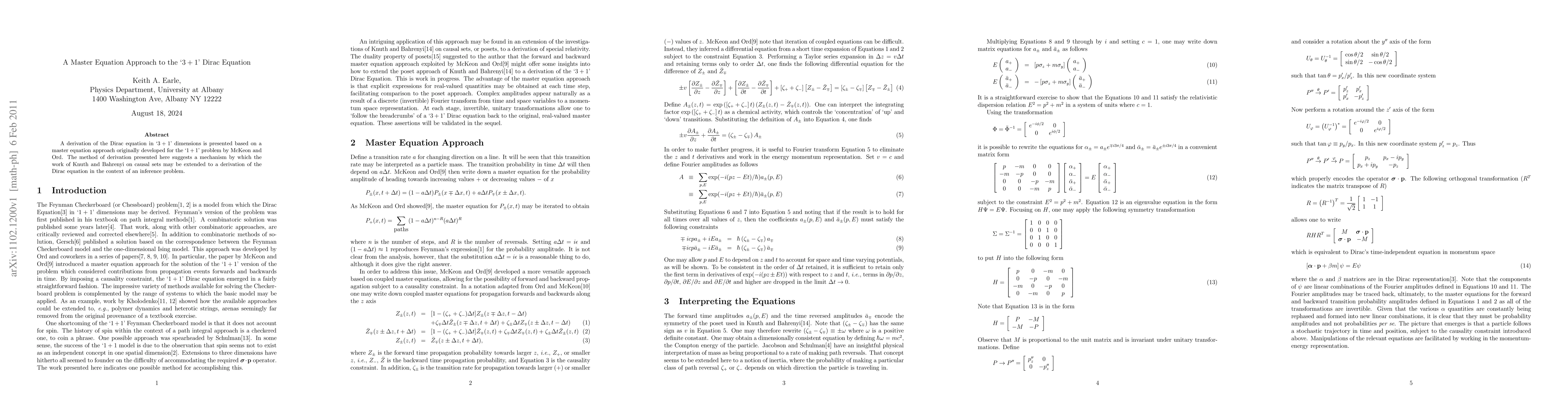 A derivation of the Dirac equation in `3+1' dimensions is presented based on a master equation approach originally developed for the `1+1' problem by McKeon and Ord. The method of derivation presented here suggests a mechanism by which the work of Knuth and Bahrenyi on causal sets may be extended to a derivation of the Dirac equation in the context of an inference problem.