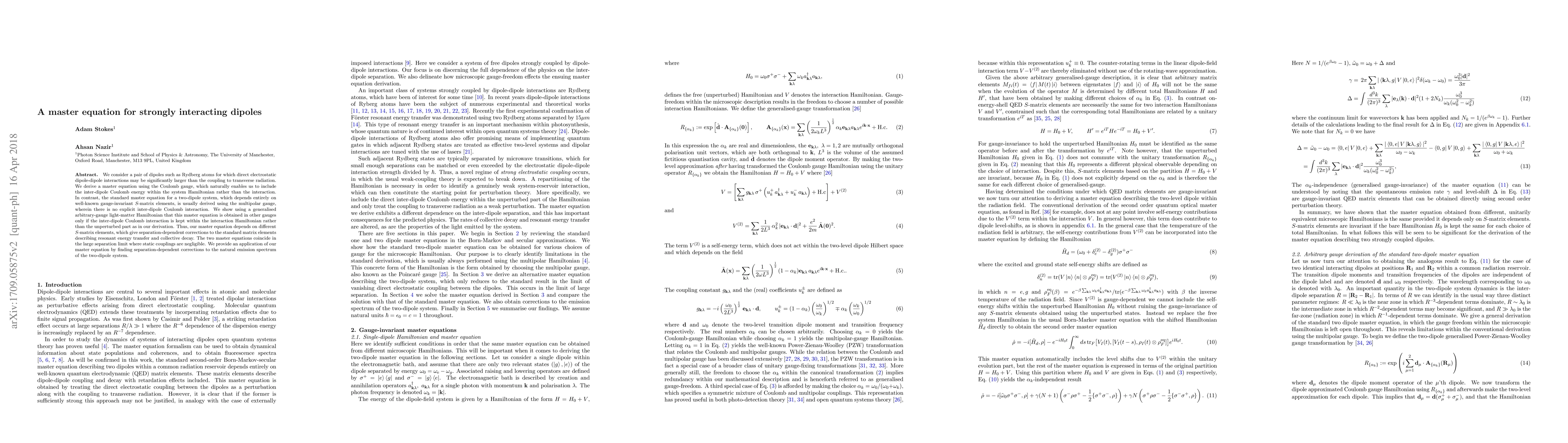 The paper develops a new master equation for strongly interacting dipoles that includes Coulomb interactions explicitly in the system Hamiltonian, revealing separation-dependent effects on energy transfer and emission spectra. This approach offers deeper insight into how static Coulomb forces influence collective dipole behavior beyond standard models.