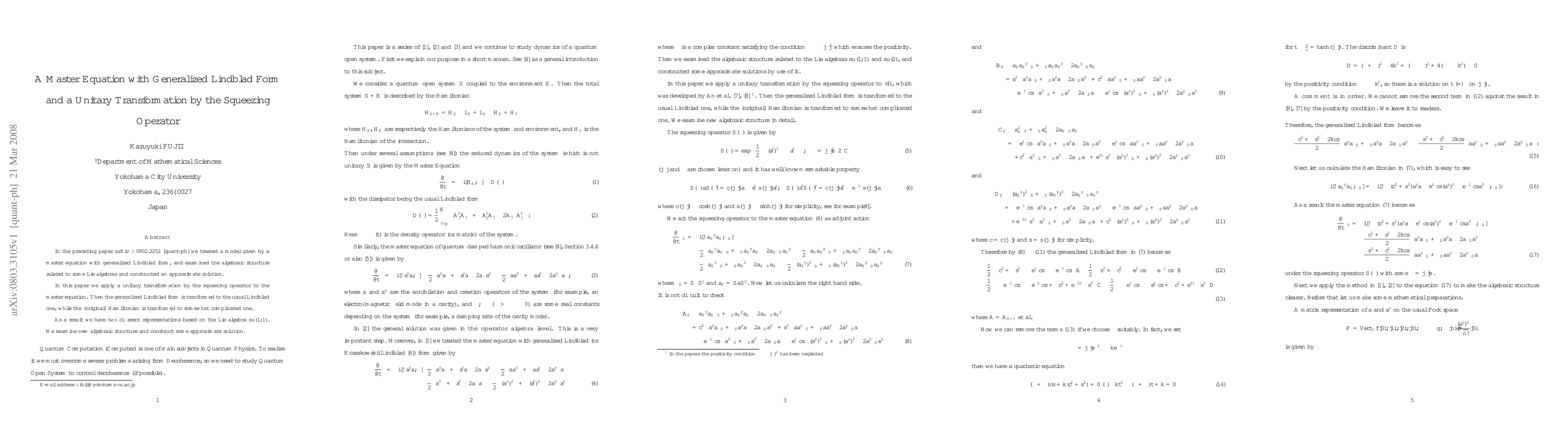 This paper applies a unitary transformation using the squeezing operator to a master equation with generalized Lindblad form, transforming it into a standard Lindblad form while altering the original Hamiltonian. It explores new algebraic structures based on su(1,1) and constructs approximate solutions.