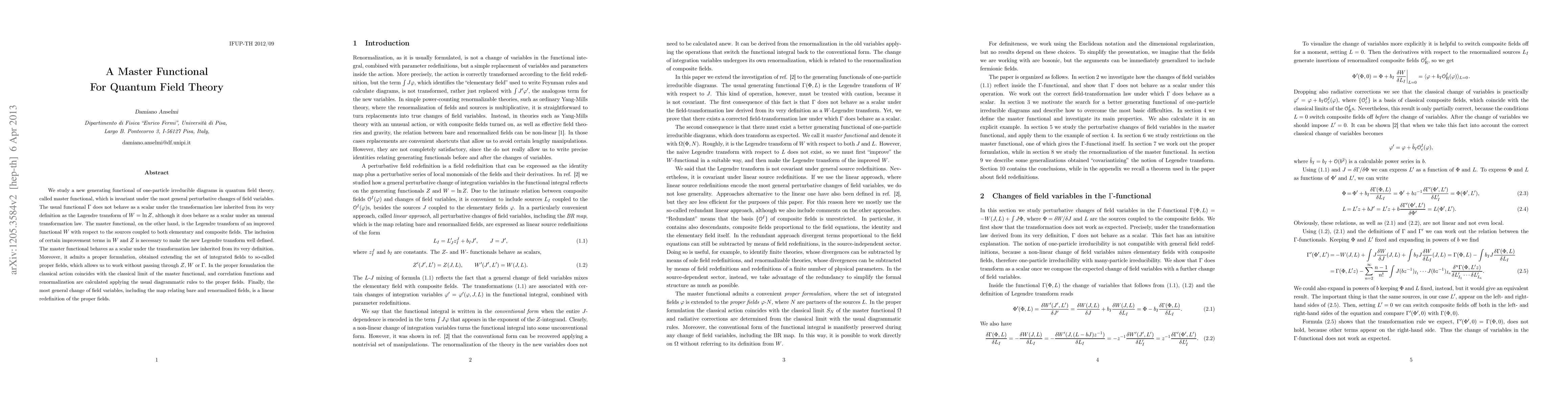 We study a new generating functional of one-particle irreducible diagrams in quantum field theory, called master functional, which is invariant under the most general perturbative changes of field variables. The usual functional Gamma does not behave as a scalar under the transformation law inherited from its very definition as the Legendre transform of W = ln Z, although it does behave as a scalar under an unusual transformation law. The master functional, on the other hand, is the Legendre transform of an improved functional W with respect to the sources coupled to both elementary and composite fields. The inclusion of certain improvement terms in W and Z is necessary to make the new Legendre transform well defined. The master functional behaves as a scalar under the transformation law inherited from its very definition. Moreover, it admits a proper formulation, obtained extending the set of integrated fields to so-called proper fields, which allows us to work without passing through Z, W or Gamma. In the proper formulation the classical action coincides with the classical limit of the master functional, and correlation functions and renormalization are calculated applying the usual diagrammatic rules to the proper fields. Finally, the most general change of field variables, including the map relating bare and renormalized fields, is a linear redefinition of the proper fields.