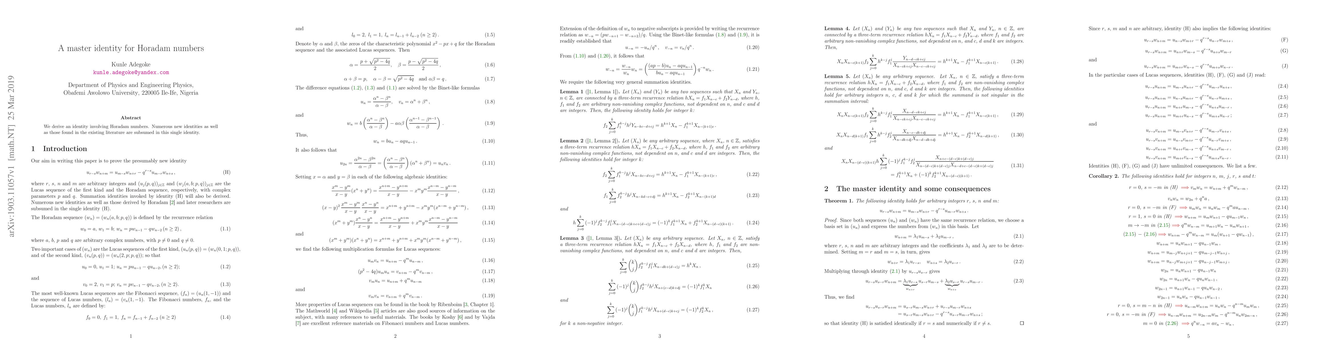 Summary: This paper presents a master identity encompassing Horadam numbers, subsuming numerous existing identities and introducing new ones under a single framework.