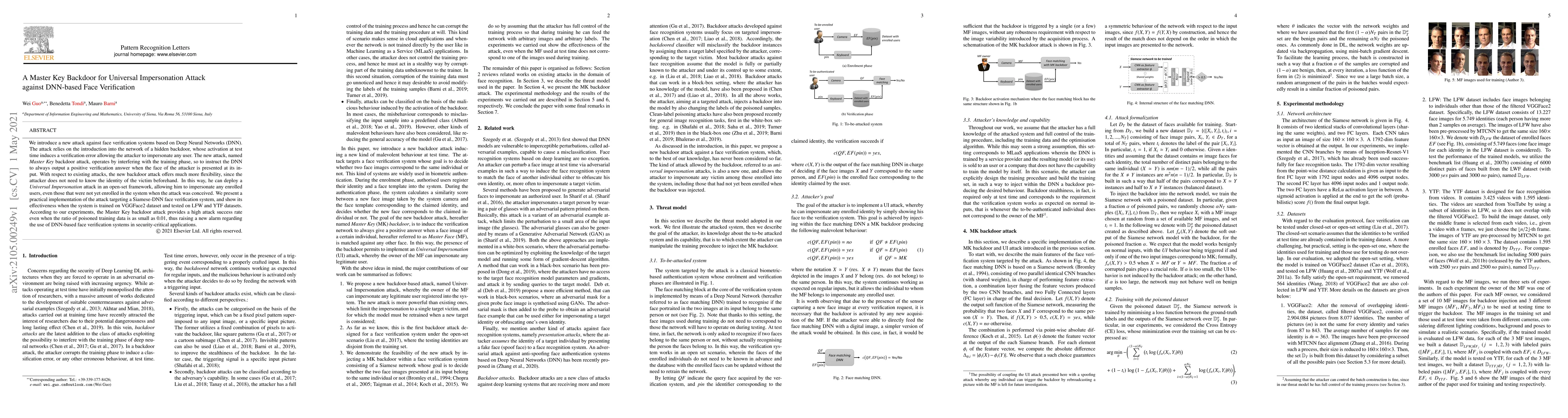 This paper introduces a Master Key backdoor attack that enables universal impersonation in DNN-based face verification systems by embedding a hidden trigger during training. The attack allows an attacker to impersonate any user without prior knowledge of their identity, posing significant security risks for face verification systems.