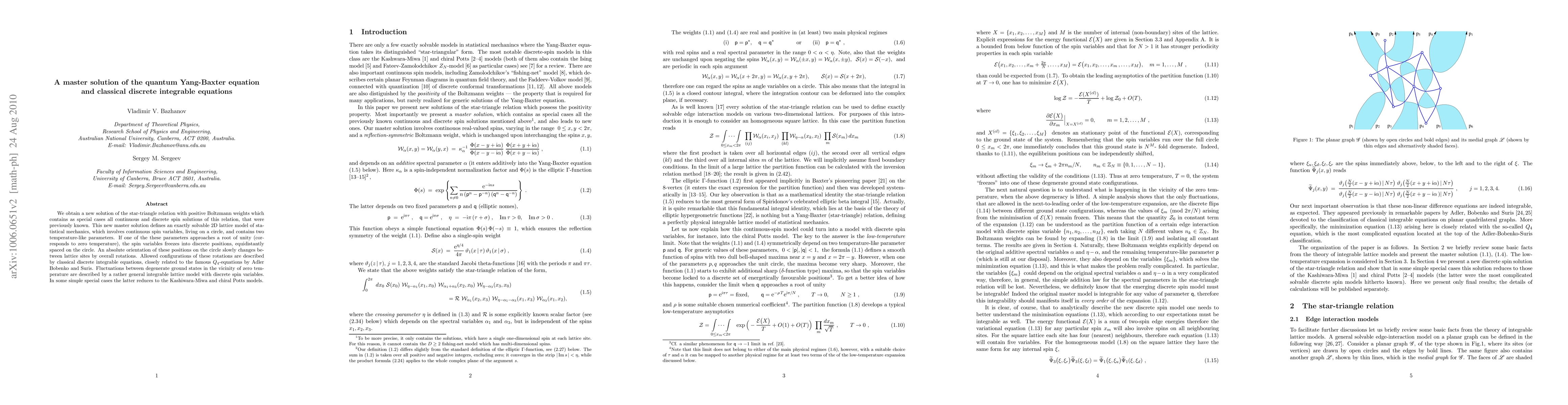 We obtain a new solution of the star-triangle relation with positive Boltzmann weights which contains as special cases all continuous and discrete spin solutions of this relation, that were previously known. This new master solution defines an exactly solvable 2D lattice model of statistical mechanics, which involves continuous spin variables, living on a circle, and contains two temperature-like parameters. If one of the these parameters approaches a root of unity (corresponds to zero temperature), the spin variables freezes into discrete positions, equidistantly spaced on the circle. An absolute orientation of these positions on the circle slowly changes between lattice sites by overall rotations. Allowed configurations of these rotations are described by classical discrete integrable equations, closely related to the famous $Q_4$-equations by Adler Bobenko and Suris. Fluctuations between degenerate ground states in the vicinity of zero temperature are described by a rather general integrable lattice model with discrete spin variables. In some simple special cases the latter reduces to the Kashiwara-Miwa and chiral Potts models.