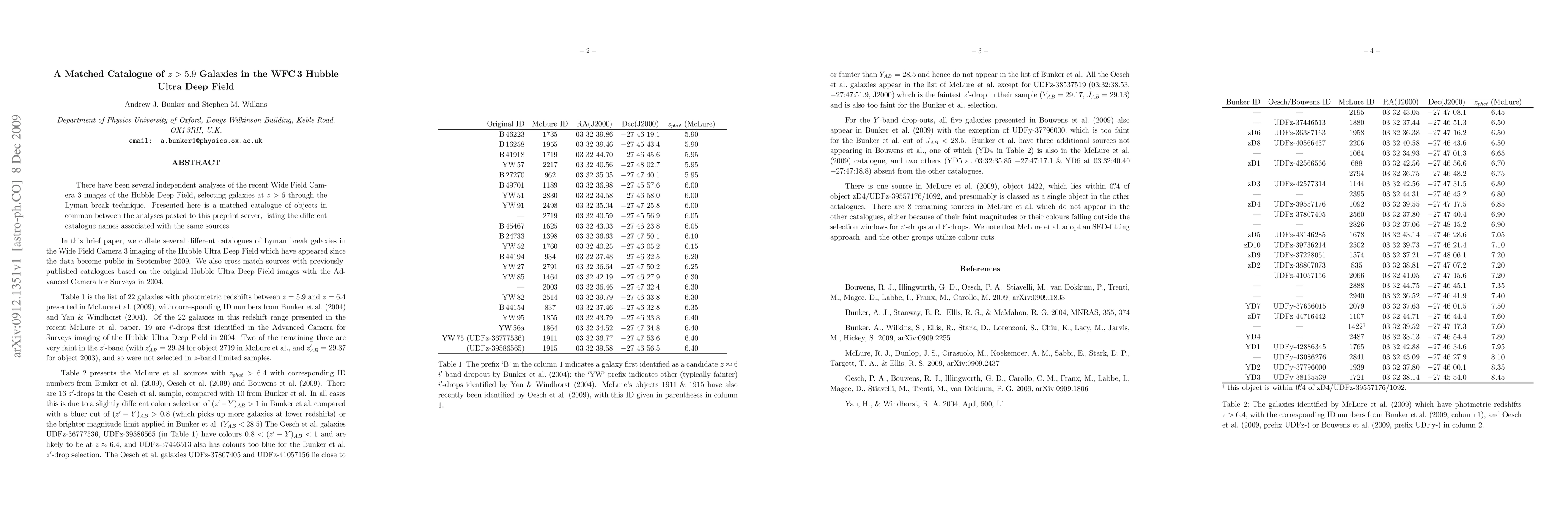 There have been several independent analyses of the recent Wide Field Camera 3 images of the Hubble Deep Field, selecting galaxies at z>6 through the Lyman break technique. Presented here is a matched catalogue of objects in common between the analyses posted to this preprint server, listing the different catalogue names associated with the same sources.