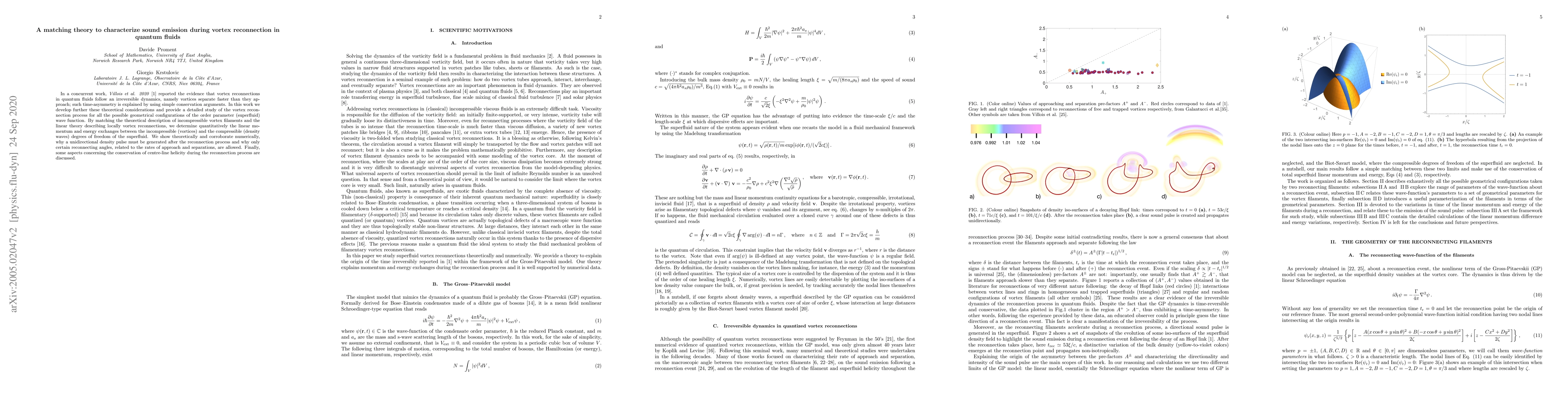 This paper develops a theoretical framework to characterize sound emission during vortex reconnection in quantum fluids, showing that reconnections are asymmetric and generate unidirectional density pulses. It quantitatively analyzes momentum and energy exchanges between vortex and density wave components, and discusses the conservation of centre-line helicity.