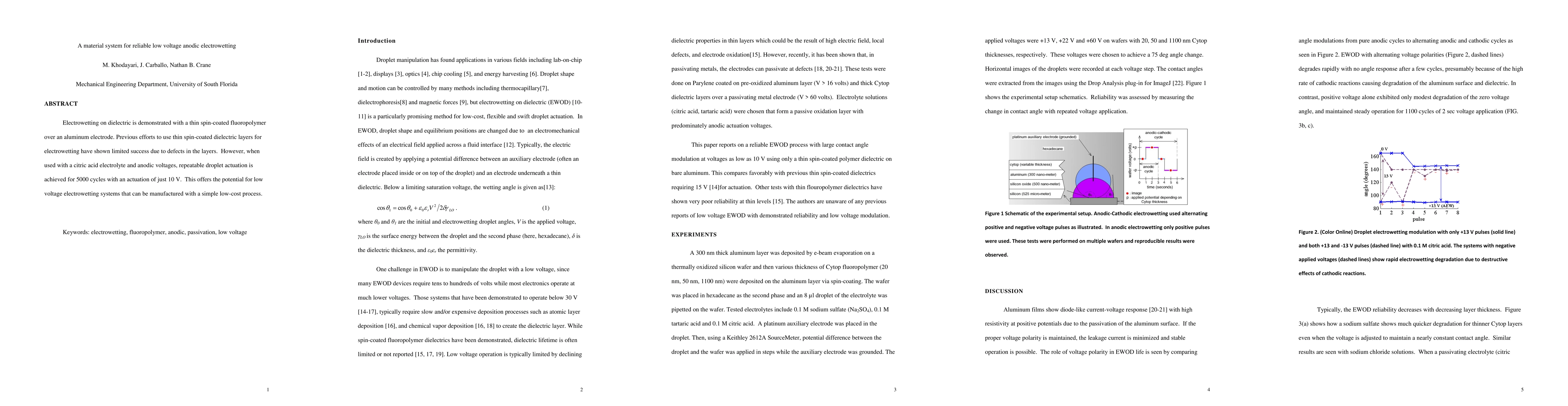 The paper presents a successful material system for reliable low voltage anodic electrowetting using a thin spin-coated fluoropolymer over an aluminum electrode with citric acid electrolyte, achieving repeatable droplet actuation over 5000 cycles at just 10 V. This innovation enables low voltage electrowetting with a simple, low-cost manufacturing process.