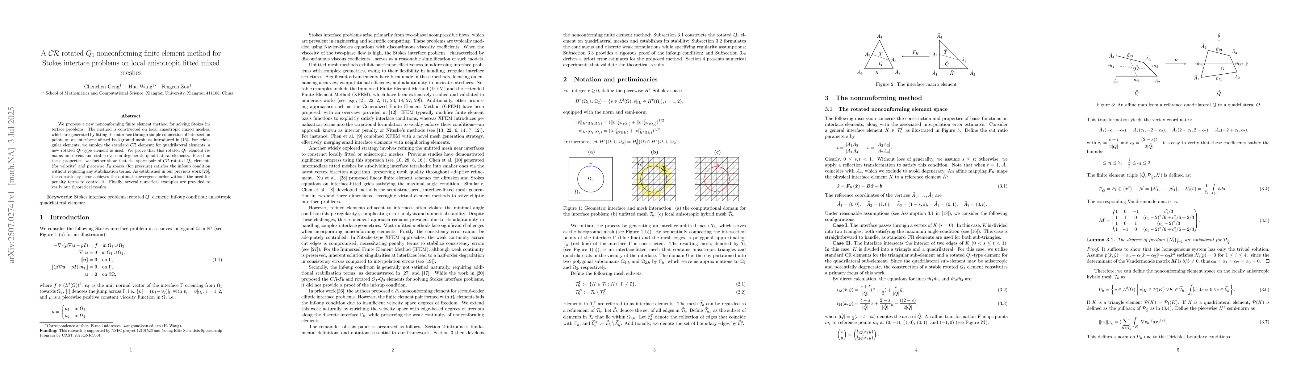 We propose a new nonconforming finite element method for solving Stokes interface problems. The method is constructed on local anisotropic mixed meshes, which are generated by fitting the interface through simple connection of intersection points on an interface-unfitted background mesh, as introduced in \cite{Hu2021optimal}. For triangular elements, we employ the standard $\mathcal{CR}$ element; for quadrilateral elements, a new rotated $Q_1$-type element is used. We prove that this rotated $Q_1$ element remains unisolvent and stable even on degenerate quadrilateral elements. Based on these properties, we further show that the space pair of $\mathcal{CR}$-rotated $Q_1$ elements (for velocity) and piecewise $P_0$ spaces (for pressure) satisfies the inf-sup condition without requiring any stabilization terms. As established in our previous work \cite{Wang2025nonconforming}, the consistency error achieves the optimal convergence order without the need for penalty terms to control it. Finally, several numerical examples are provided to verify our theoretical results.
