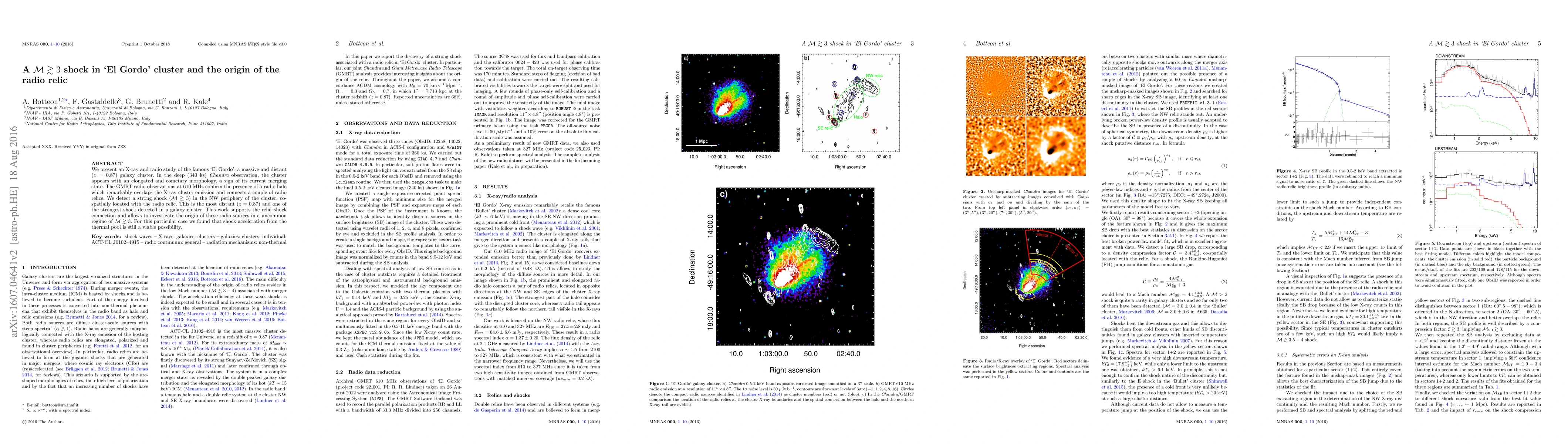 We present an X-ray and radio study of the famous `El Gordo', a massive and distant ($z=0.87$) galaxy cluster. In the deep (340 ks) Chandra observation, the cluster appears with an elongated and cometary morphology, a sign of its current merging state. The GMRT radio observations at 610 MHz reveal the presence of a radio halo which remarkably overlaps the X-ray cluster emission and connects a couple of radio relics. We detect a strong shock ($\mathcal{M}\gtrsim3$) in the NW periphery of the cluster, co-spatially located with the radio relic. This is the most distant ($z=0.87$) and one of the strongest shock detected in a galaxy cluster. This work supports the relic-shock connection and allows to investigate the origin of these radio sources in a uncommon regime of $\mathcal{M}\gtrsim3$. For this particular case we found that shock acceleration from the thermal pool is still a viable possibility.