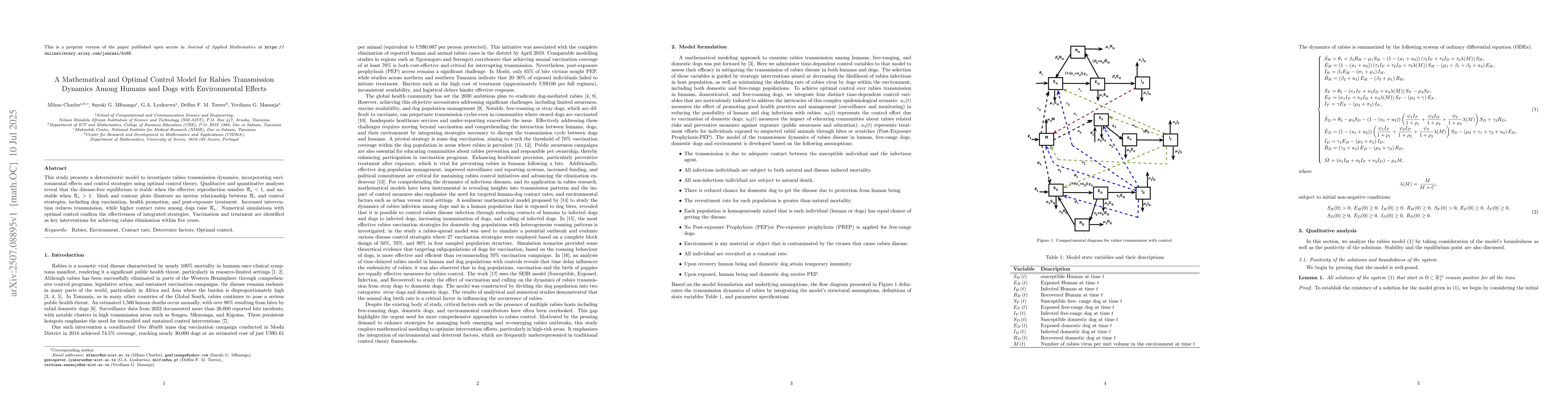 This study presents a deterministic model to investigate rabies transmission dynamics, incorporating environmental effects and control strategies using optimal control theory. Qualitative and quantitative analyses reveal that the disease-free equilibrium is stable when the effective reproduction number $\mathcal{R}_e < 1$, and unstable when $\mathcal{R}_e > 1$. Mesh and contour plots illustrate an inverse relationship between $\mathcal{R}_e$ and control strategies, including dog vaccination, health promotion, and post-exposure treatment. Increased intervention reduces transmission, while higher contact rates among dogs raise $\mathcal{R}_e$. Numerical simulations with optimal control confirm the effectiveness of integrated strategies. Vaccination and treatment are identified as key interventions for achieving rabies elimination within five years.